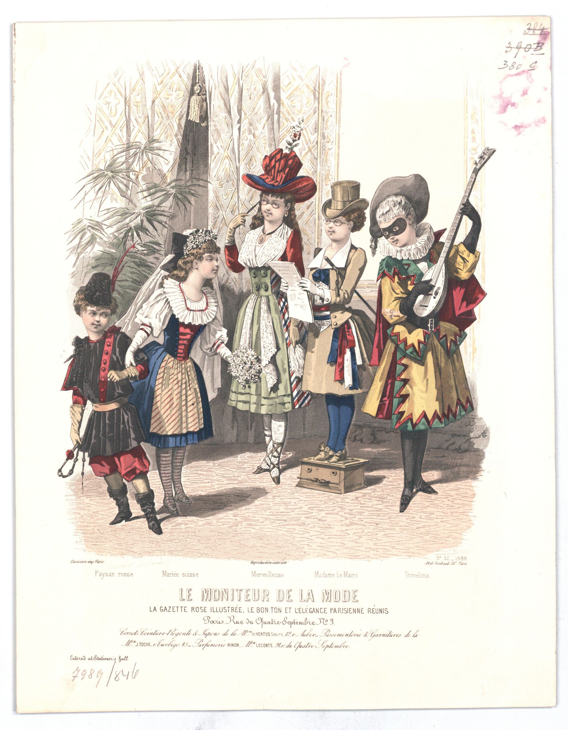 - 作品に記載されている文章: Jules David; 2331 E; N° 52 1886; Lariviere imp., Paris; Reproduction Interdite; Abel Goubaud Ed. Paris; [...]; Le Moniteur de la Mode, la gazette rose illustrée le bon ton et l'elégance parisienne réunis; Paris. Rue du Quatre-Septembre. N° 3 / [...] / Entered at Stationer's Hall