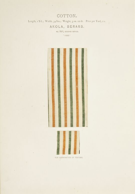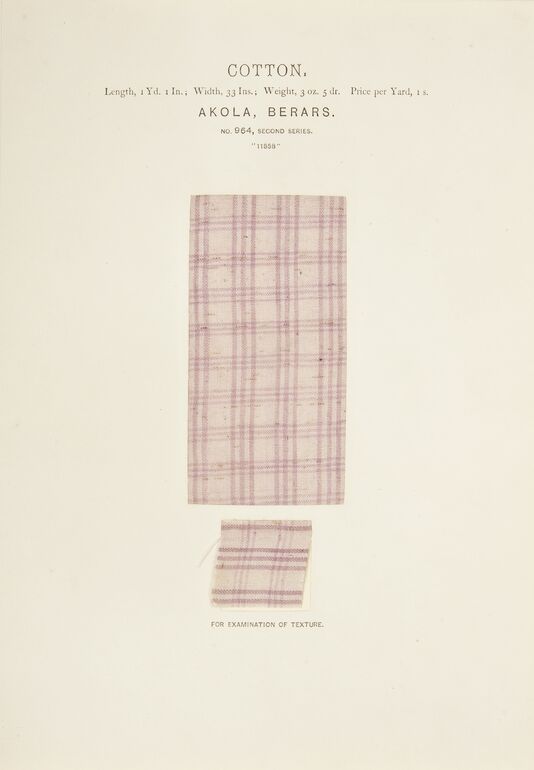 - 作品に記載されている文章: COTTON. / Length, 8 Yds. 17 ½ Ins., Width, 17 ½ Ins., Weight, 14 OZ. 10 dr. Price per Yard 8 d. / TONGHO, BURMAH. / NO. 1000, SECOND SERIES. / "11845" / FOR EXAMINATION OF TEXTURE