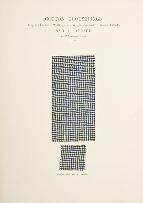 - 作品に記載されている文章: COTTON. / Length, 9 Yds., Width, 1 Yd. 2 Ins., Weight, 2 Ib. 8 OZ. / POONARY. / NO. 955, SECOND SERIES. / "11864" / FOR EXAMINATION OF TEXTURE