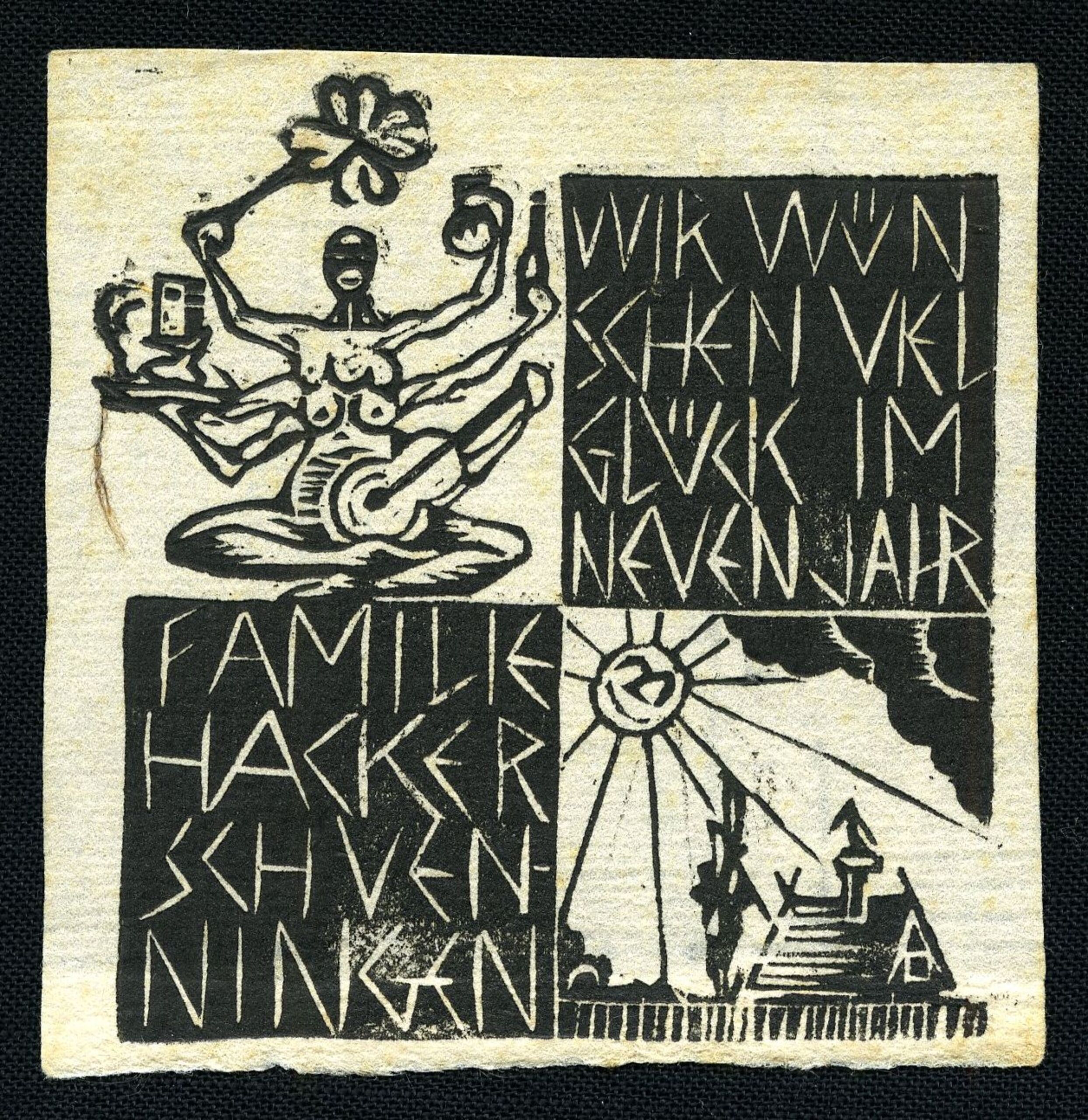 - Neujahrskarte der Familie Hacker Schünningen mit einer Darstellung einer Sonnenaufgangs über einem Haus und einer mehrarmigen maskierten Frau mit Gitarre, Staubwedel, Essen und Trinken (descriptive title)