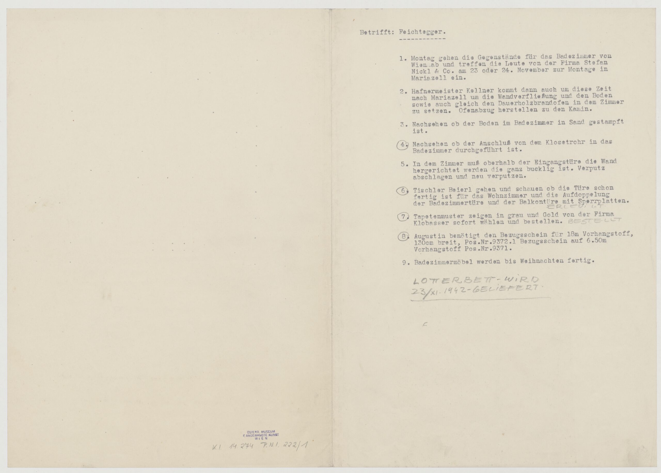 - 作品に記載されている文章 (front) : Betrifft: Feichtegger. / 1. Montag gehen die Gegenstände für das Badezimmer von / Wien ab und treffen die Leute von der Firma Stefan / Nickl & Co. am 23 oder 24. November zur Montage in / Mariazell ein. / 2. Hafnermeister Kellner kommt dann auch um diese Zeit nach Mariazell um die Wandverfließung und den Boden / sowie auch gleich den Dauerholzbrandofen in dem Zimmer / zu setzen. / Ofenabzug herstellen zu dem Kamin. / 3. Nachsehen ob der Boden im Badezimmer in Sand gestampft / ist. / 4. Nachsehen ob der Anschluß vom dem Klosetrohr in das / Badezimmer durchgeführt ist. / 5. In dem Zimmer muß oberhalb der Eingangstüre die Wand / hergerichtet werden die ganz bucklig ist. Verputzt / abgeschlagen und neu verputzt. / 6. Tischler Beierl gehen und schauen ob die Türe schon / fertig ist für das Wohnzimmer und die Aufdoppelung / der Badezimmertüre und der Balkontüre mit Sperrplatten. / 7. Tapetenmuster zeigen in grau und Gold von der Firma / Klobasser sofort wählen und bestellen. / 8. Augustin benötigt den Bezugsschein für 18m Vorhangstoff, / 130cm breit, Pos. Nr. 9372.1 Bezugsschein auf 6.50m / Vorhangstoff Pos. Nr. 9371. / Badezimmermöbel werden bis Weihnachten fertig.