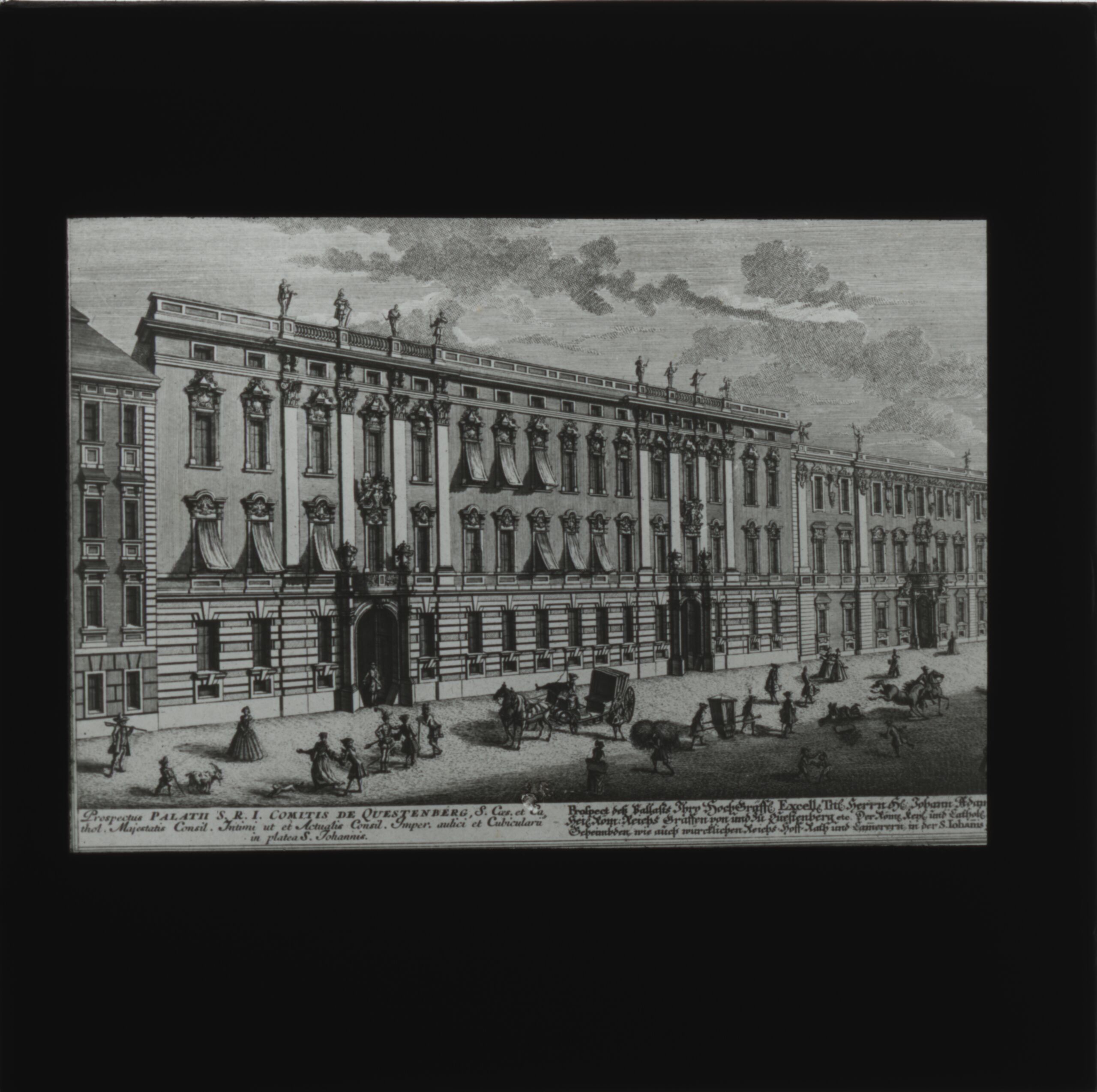 - Text am Objekt: Prospectus Palatii S. R. I. Comitis de Questenberg, S. Caes. et Cathol. Majestaatis Consil. Intimi ut et Actualis Consil. Imper. autici et Cubicularii in platea S. Johannis. Prospect deß Pallasts Ihro Hoch Gräffl; Excell: Titl; Herrn Hl: Johann Adam deß Heil; Röm: Reichs Graffen von und zu Questenberg etc. Der Röm; Key; und Cathol; Mayl; Geheimbden wie auch würcklichen Reichs-Hoff Rath und Cammerern, in der S. Iohannis Gaßen