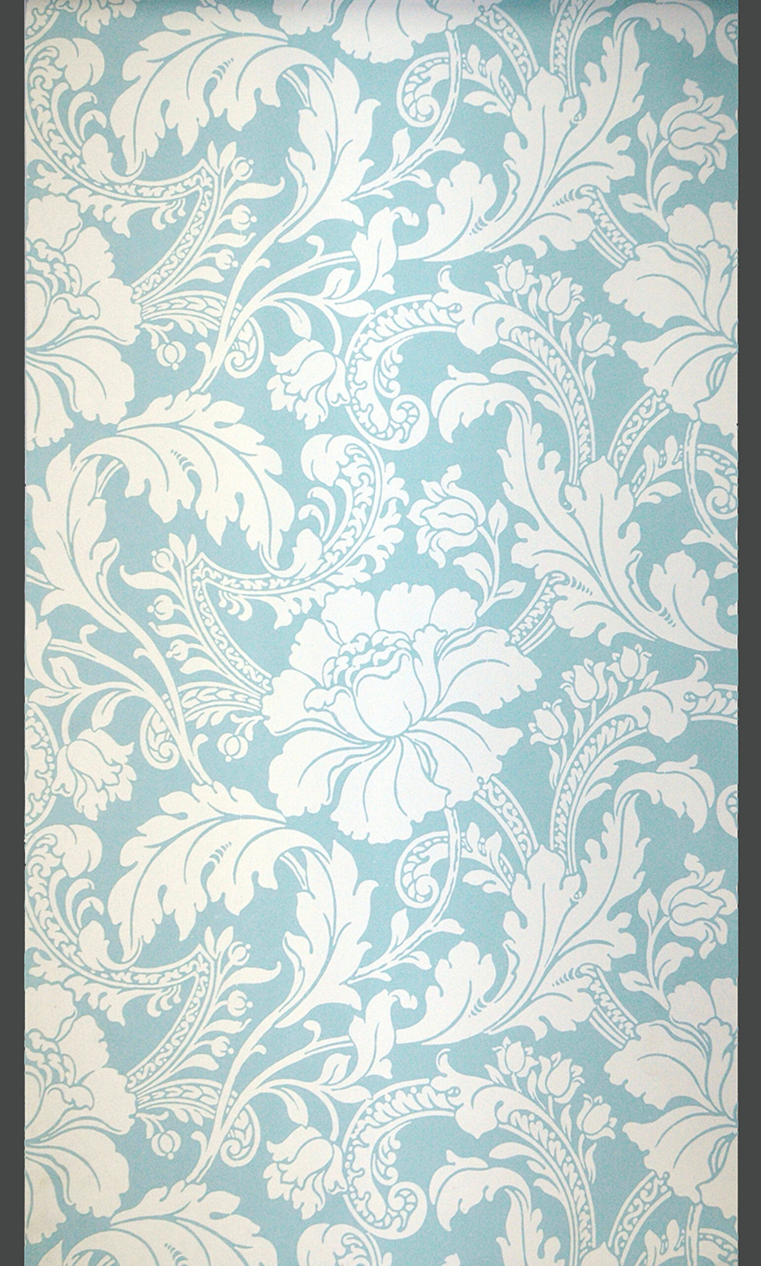 - Pale tendrils with large flowers and curled up leaves, on light blue background (descriptive title)