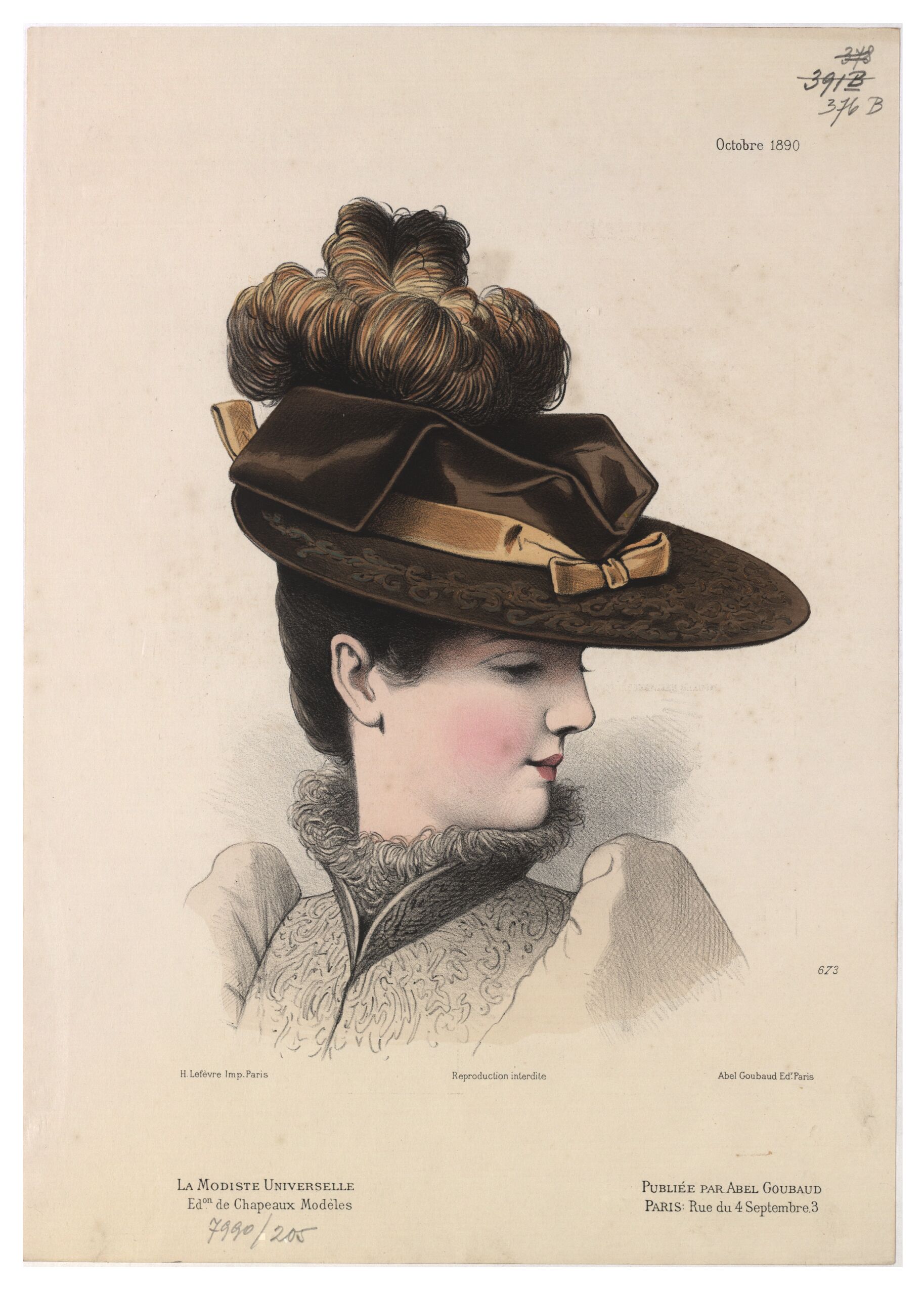 - 作品に記載されている文章: [Links unten:] H. Lefèvre Imp. Paris / La Modiste Universelle / Edon. de Chapeaux Modèles [Unten in der Mitte:] Reproduction interdite [Rechts oben:] Octobre 1890 [Rechts unten:] 673 / Abel Goubaud Edr. Paris / Publiée par Abel Goubaud / Paris: Rue du 4 Septembre, 3 [Gedruckter Text]