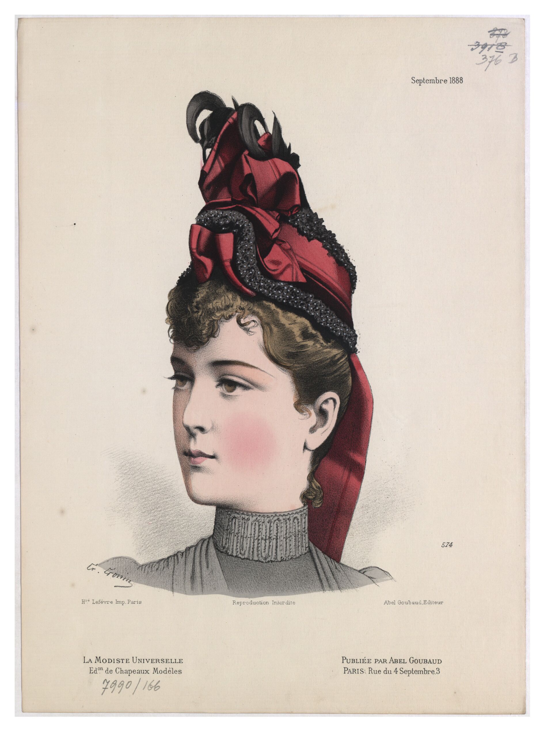 - 作品に記載されている文章: [Links unten:] G. Gonin / Hré. Lefèvre Imp. Paris / La Modiste Universelle / Edon. de Chapeaux Modèles [Unten in der Mitte:] Reproduction Interdite [Rechts oben:] Septembre 1888 [Rechts unten:] 574 / Abel Goubaud, Editeur / Publiée par Abel Goubaud / Paris: Rue du 4 Septembre, 3 [Gedruckter Text]