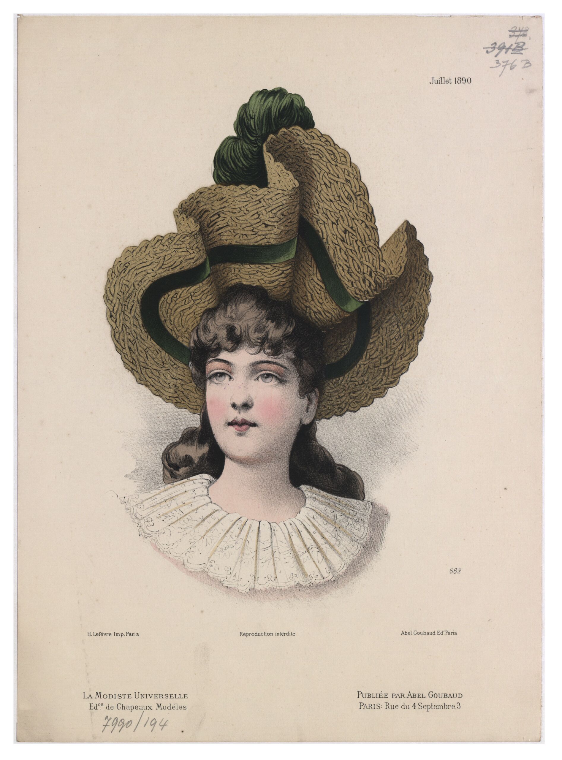 - 作品に記載されている文章: [Links unten:] H. Lefèvre Imp. Paris / La Modiste Universelle / Edon. de Chapeaux Modèles [Unten in der Mitte:] Reproduction interdite [Rechts oben:] Juillet 1890 [Rechts unten:] 662 / Abel Goubaud Edr. Paris / Publiée par Abel Goubaud / Paris: Rue du 4 Septembre, 3 [Gedruckter Text]