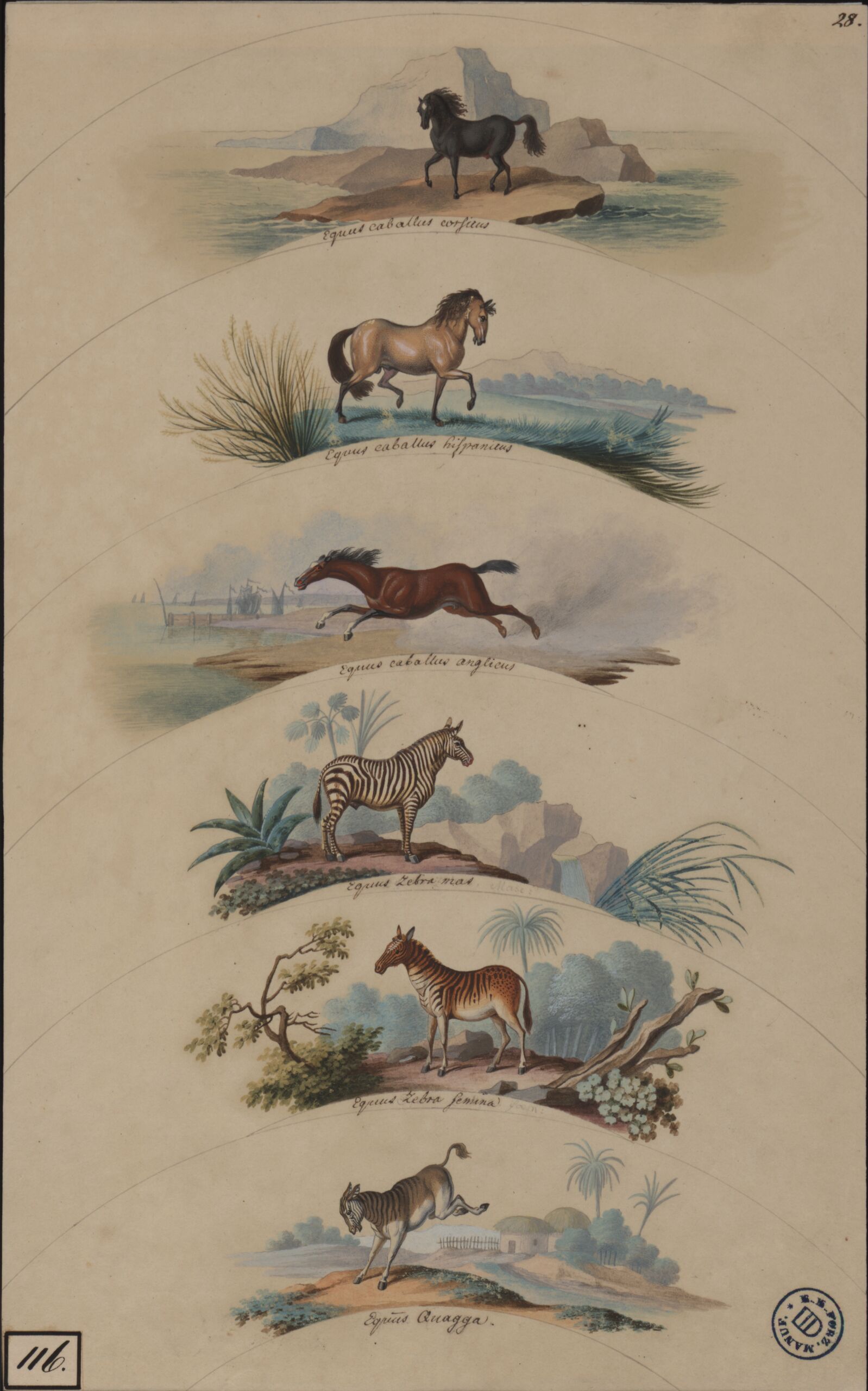 - 作品に記載されている文章: 28. / Equus caballus corficus / Equus caballus hispanicus / Equus caballus anglicus / Equus Zebra mas / Equus Zebra femina / Equus Quagga