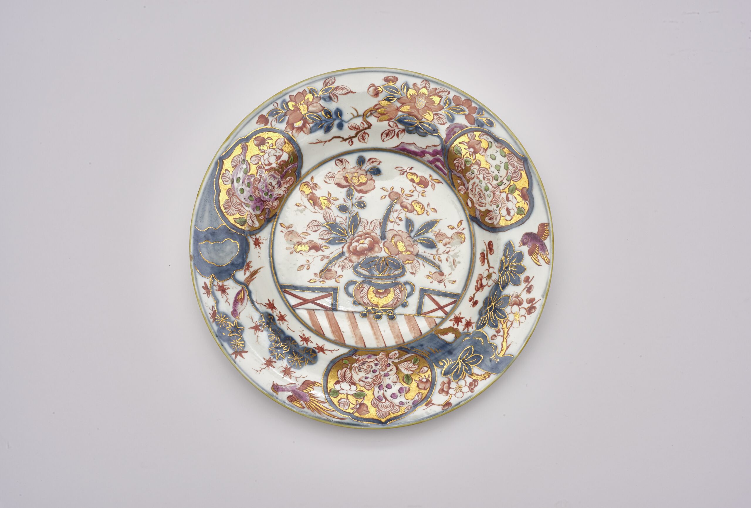 Teller, tief gekehlte, runde Form auf Standring, mit geweiteter Lippe. Dekor nach japanischem Vorbild in Kombination von Unterglasurblau und den Farben Rot, Violett, Grün und Gold über der Glasur. Die breite Randzone, die sich über Fahne und Kehle erstreckt, wird von unterglasurblauen umlaufenden Streifen umschlossen und besteht aus drei unterglasurblau gerahmten lotusblütenförmigen Feldern mit Fo- Hunden, von Blütenzweigen umgeben. Zwischen diesen Feldern Astwerk und Zweige mit Vögeln. Im Spiegel Blumenvase, die auf einem schräg gestreiften, durch eine Horizontallinie begrenzten Boden steht, auf der links und rechts eine Umzäunung angedeutet wird. Auf der Unterseite des Tellers unterglasurblaue Blumenzweige und Blüten, in roter Überglasurfarbe gehöht