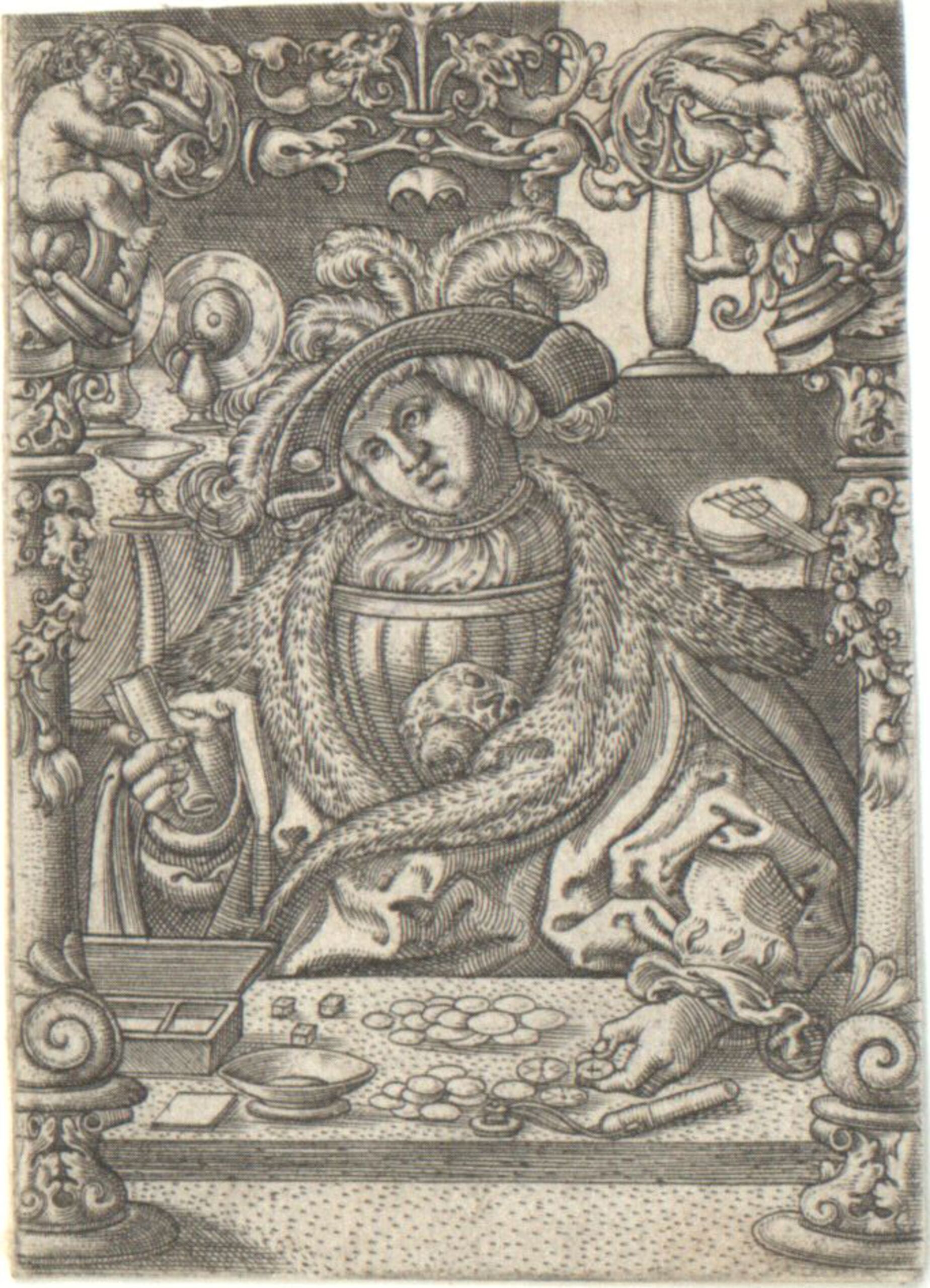 Druckgrafik, Porträt eines Mannes von Ornamenten umgeben, möglicherweise ein Selbstporträt, Allaert Claesz, MAK Inv.nr. KI 1443