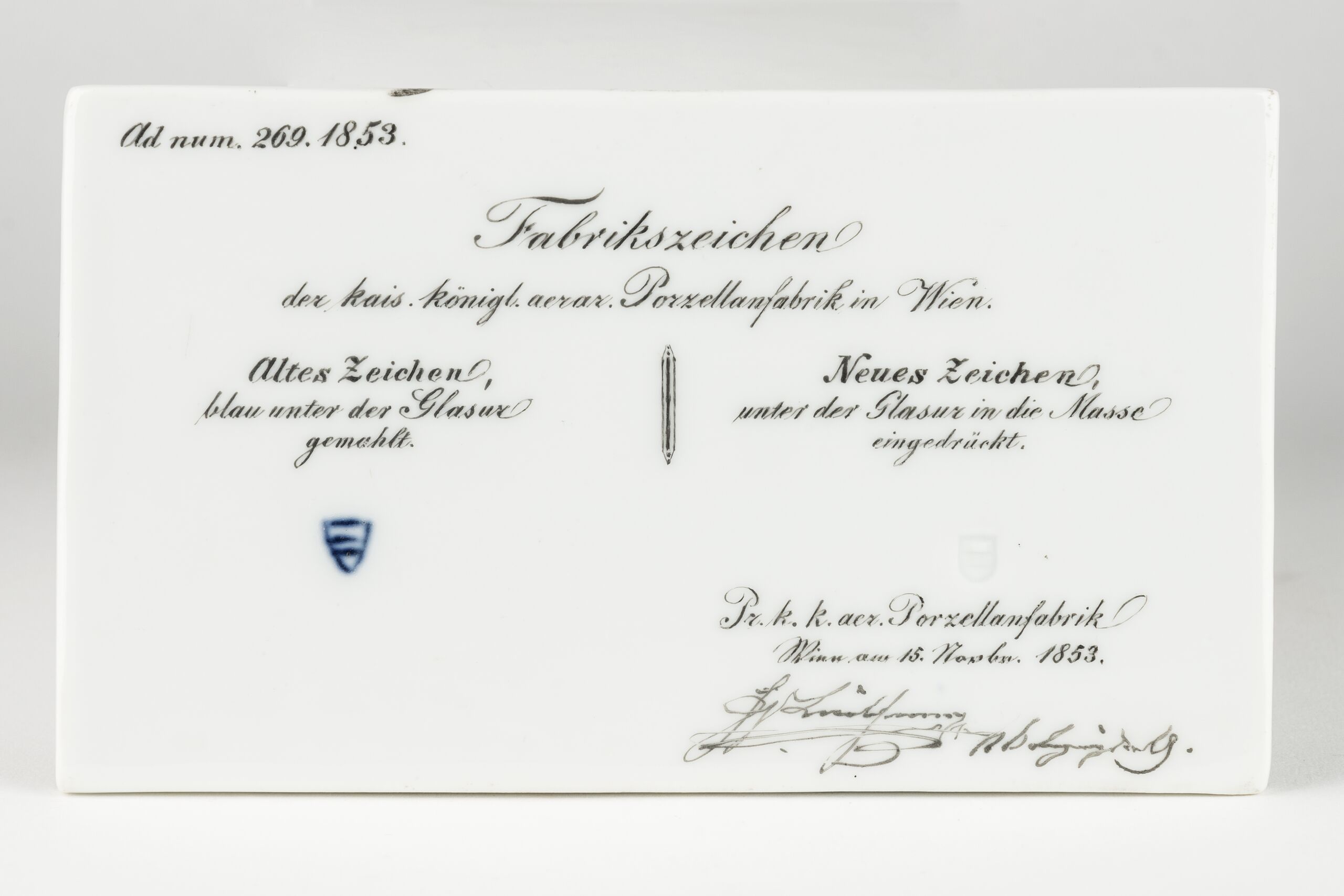 Querrechteckige, weiß glasierte Porzellanplatte, links oben bez.: Ad num. 269.1853“ mit dem unterglasurblauen Bindenschild in der linken, dem eingepressten Bindenschild in der rechten Hälfte. Die Beschriftung der Platte in Schwarz lautet: „Fabrikszeichen der kais.königl.aerar. Porzellanfabrik in Wien. Altes Zeichen blau unter der Glasur gemahlt. Neues Zeichen, unter der Glasur in die Masse eingedrückt. Pr.k.k.aer. Porzellanfabrik. Wien, am 15. Novbr.1853 Fz Leithner, k.k. Regierungsrath.“