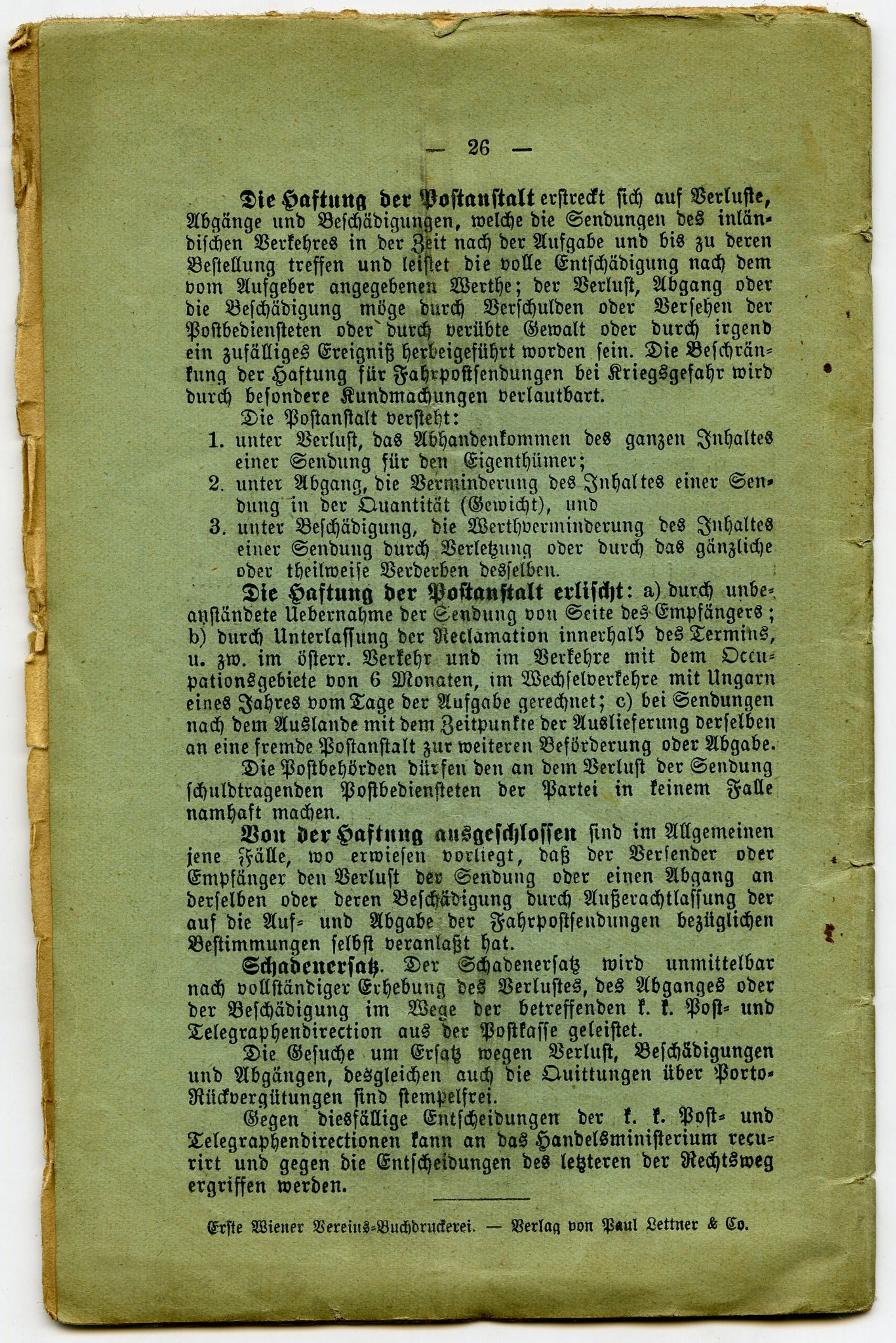 - Text am Objekt (Rückseite) : 26 / Die Haftung der Postanstalt erstreckt sich auf Verluste, / Abgänge und Beschädigungen, [...] / Erste Wiener Vereins-Buchdruckerei. - Verlag von Paul Lettner & Co.