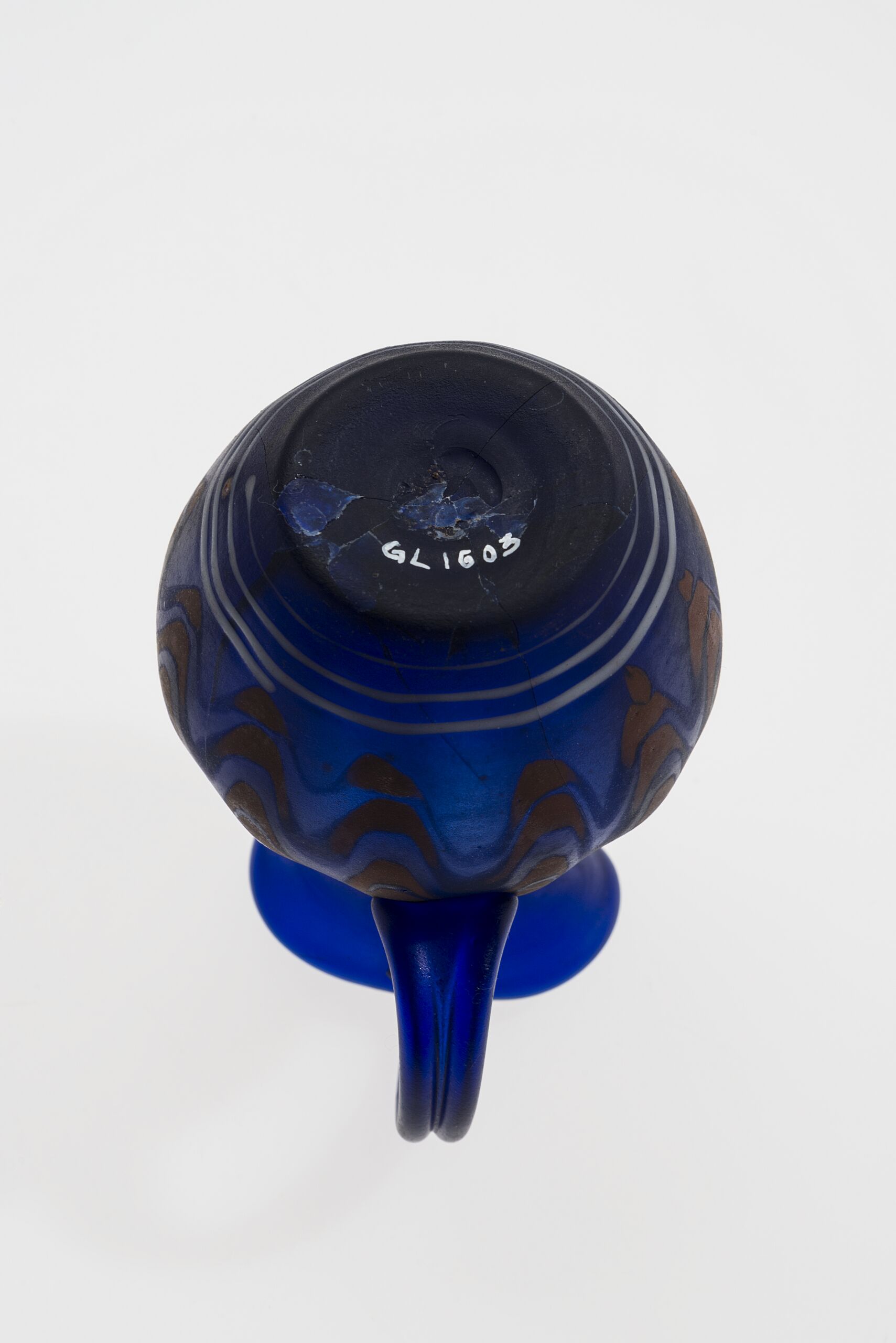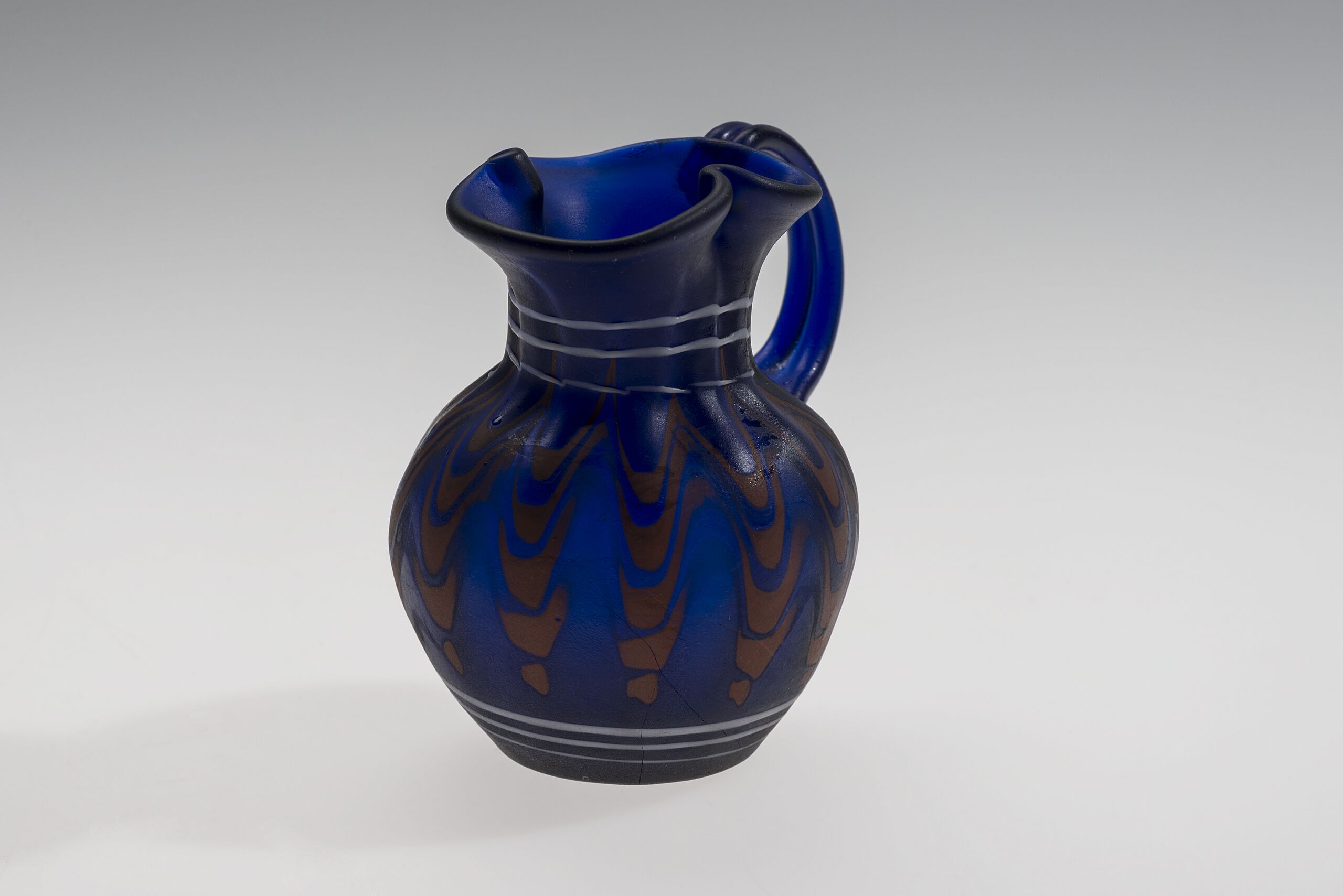 mit Henkel und Ausguß, mosaikartig in rot und weiß auf hellblauem Grund. Dunkelblaues halbopakes Glas mit braunen Flecken und weißen eingeschmolzenen Fäden, gekämmter Dekor