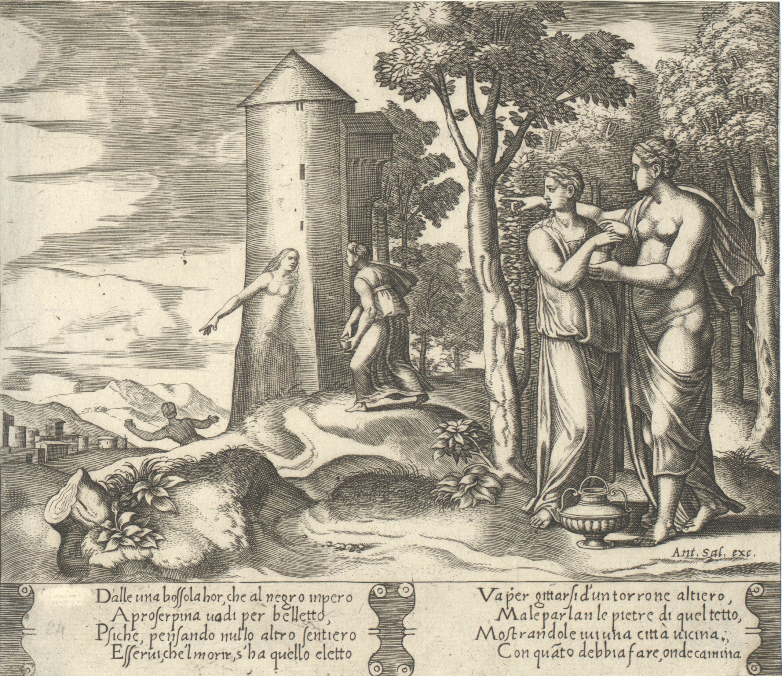 - Psyche bricht in die Unterwelt auf, Blatt 24 aus der Folge der Fabel der Psyche, Abdruck der von Franc. Villamena überarbeiteten Platten, herausgegeben von A. Salamanca; nach Vasari soll Michiel Coxcie die Vorlagen für die Stiche angefertigt haben (given title)
