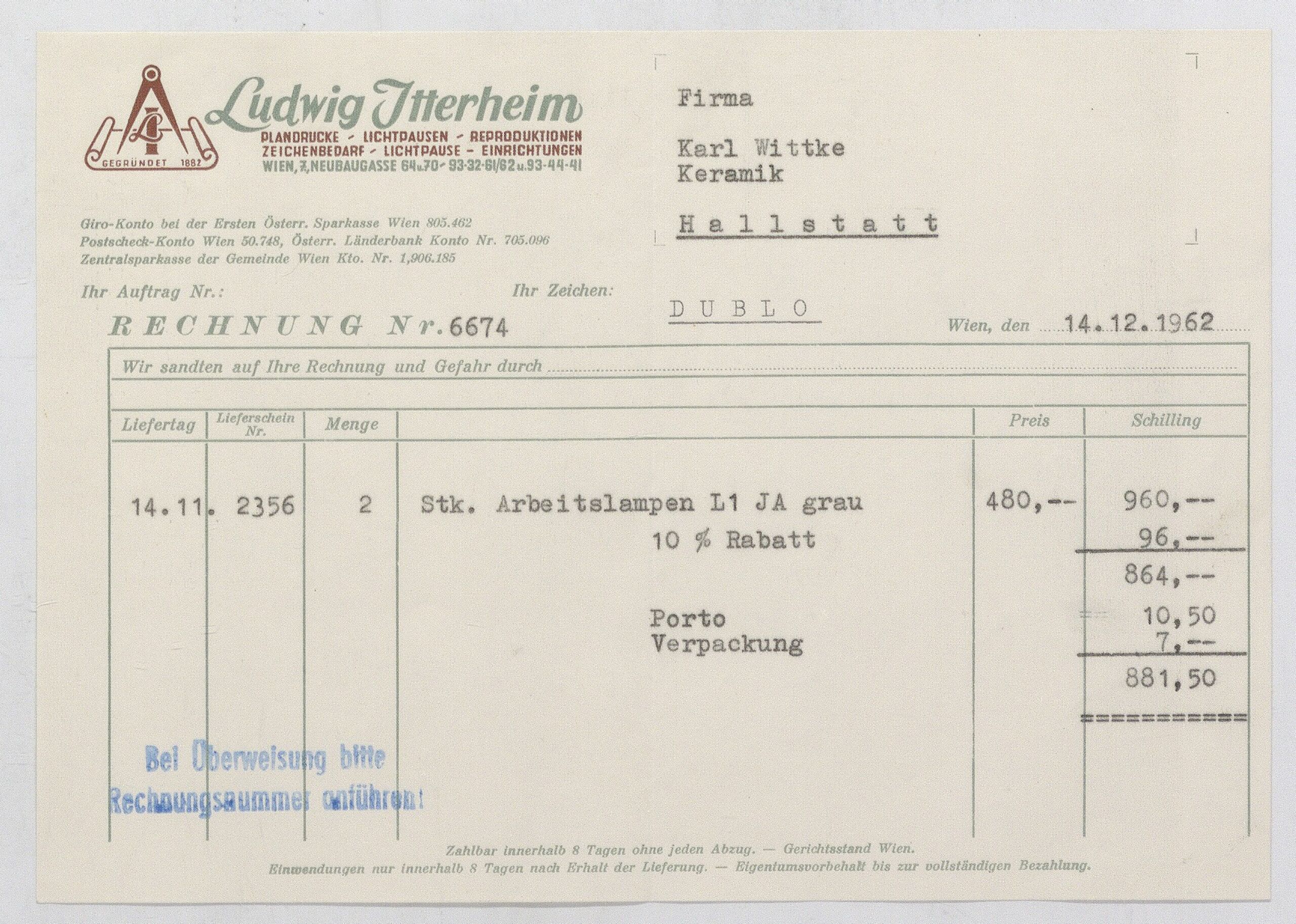 invoice, Rechnung für zwei Arbeitslampen, Lichtpausanstalt Ludwig Itterheim, MAK Inv.nr. KI 16475-5-628