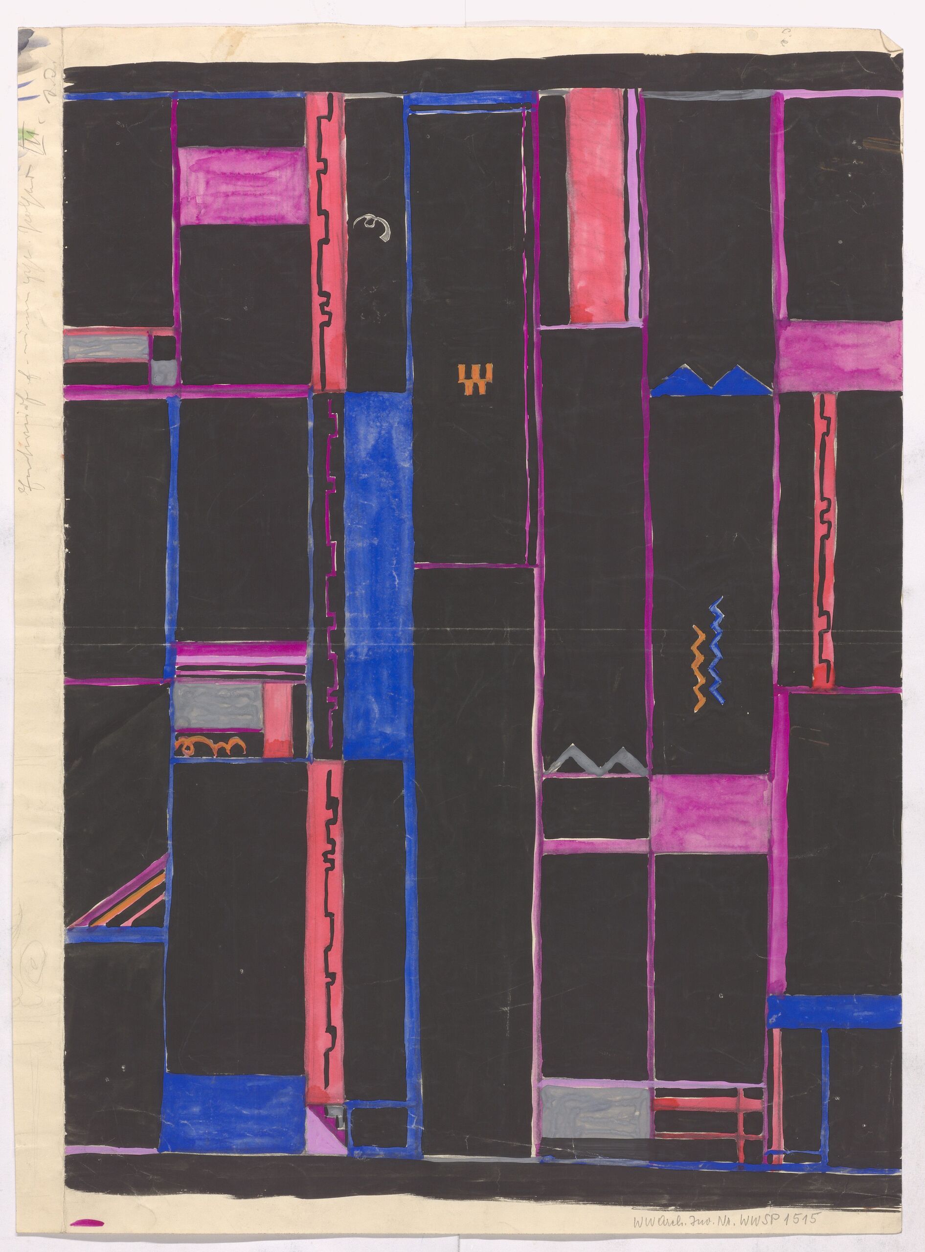final artwork, Rechteckiger Polster (Kissen), Linienmotive in blau, rot und grau auf schwarzem Grund, Wiener Werkstätte, MAK Inv.nr. WWSP 1515
