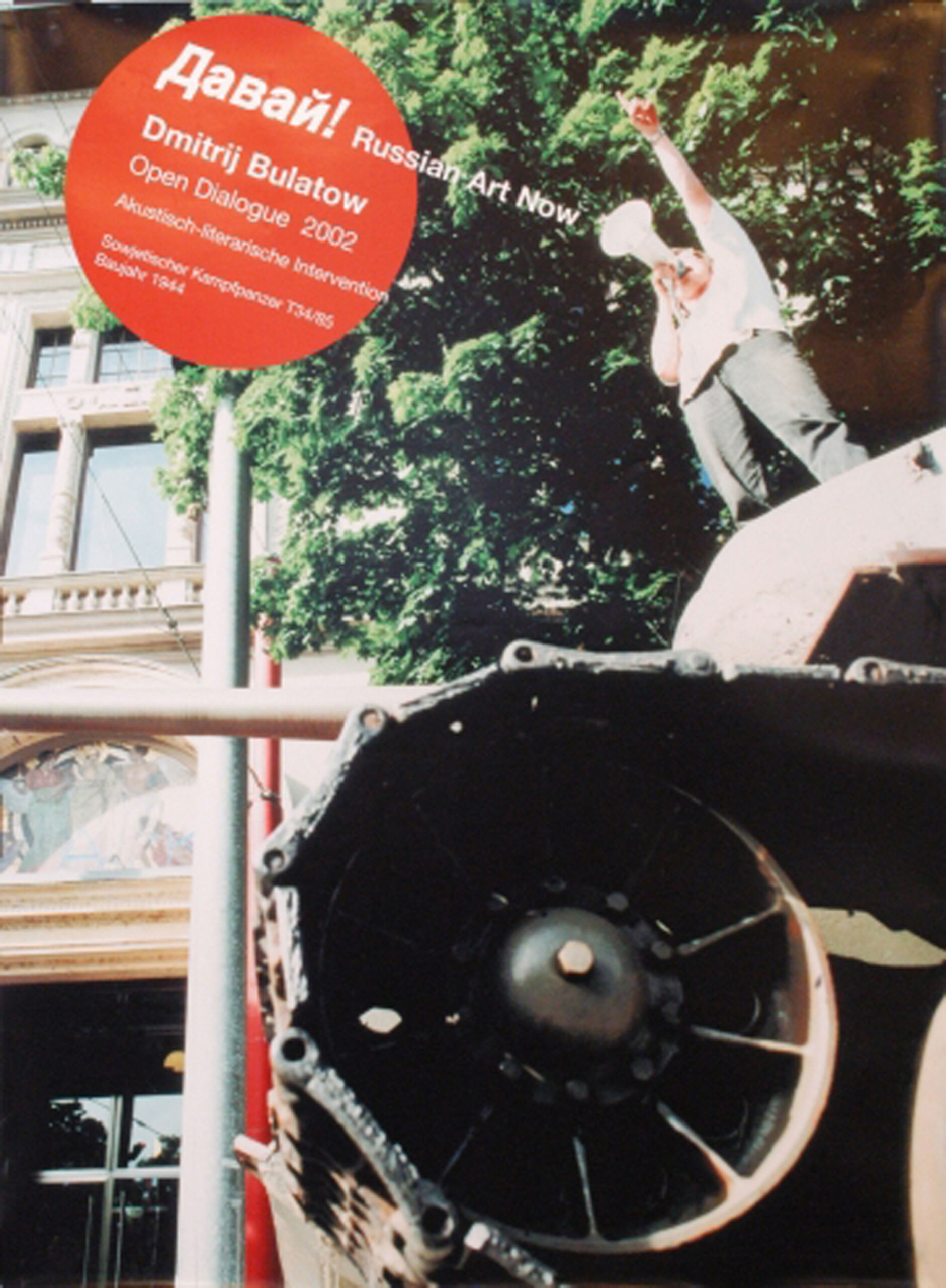 - 作品に記載されている文章: [Davaj; in kyrillischer Schrift]! Russian art now. Dmitrij Bulatow. Open Dialogue 2002. Akustisch-literarische Intervention Sowjetischer Kampfpanzer T34/85 Baujahr 1944 [MAK 19.6.-22.9.2002. MAK Ausstellungshalle]