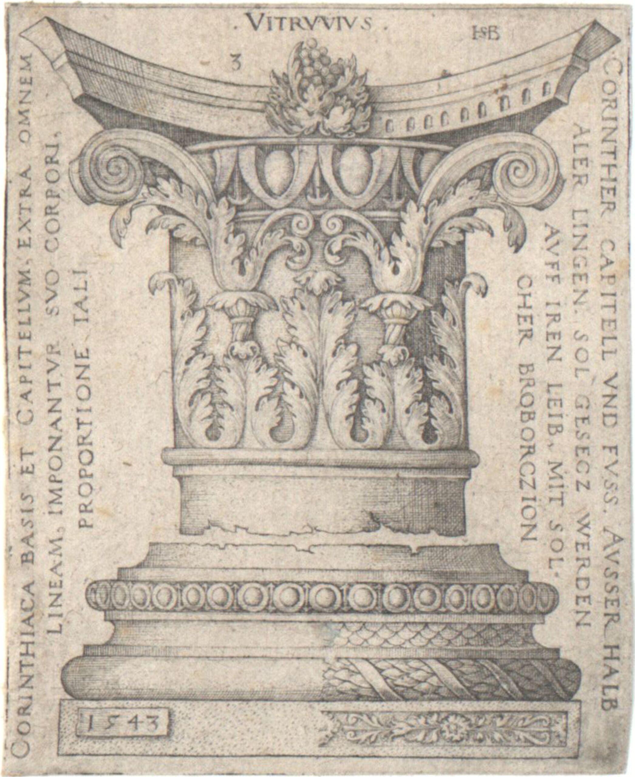 - 作品に記載されている文章: VITRUVIUS/ 3 / Monogramm HSB 1543 / CORINTHICA BASIS ET CAPITELLUM ... TALI / CORINTHER CAPITELL ... BROBORCZION