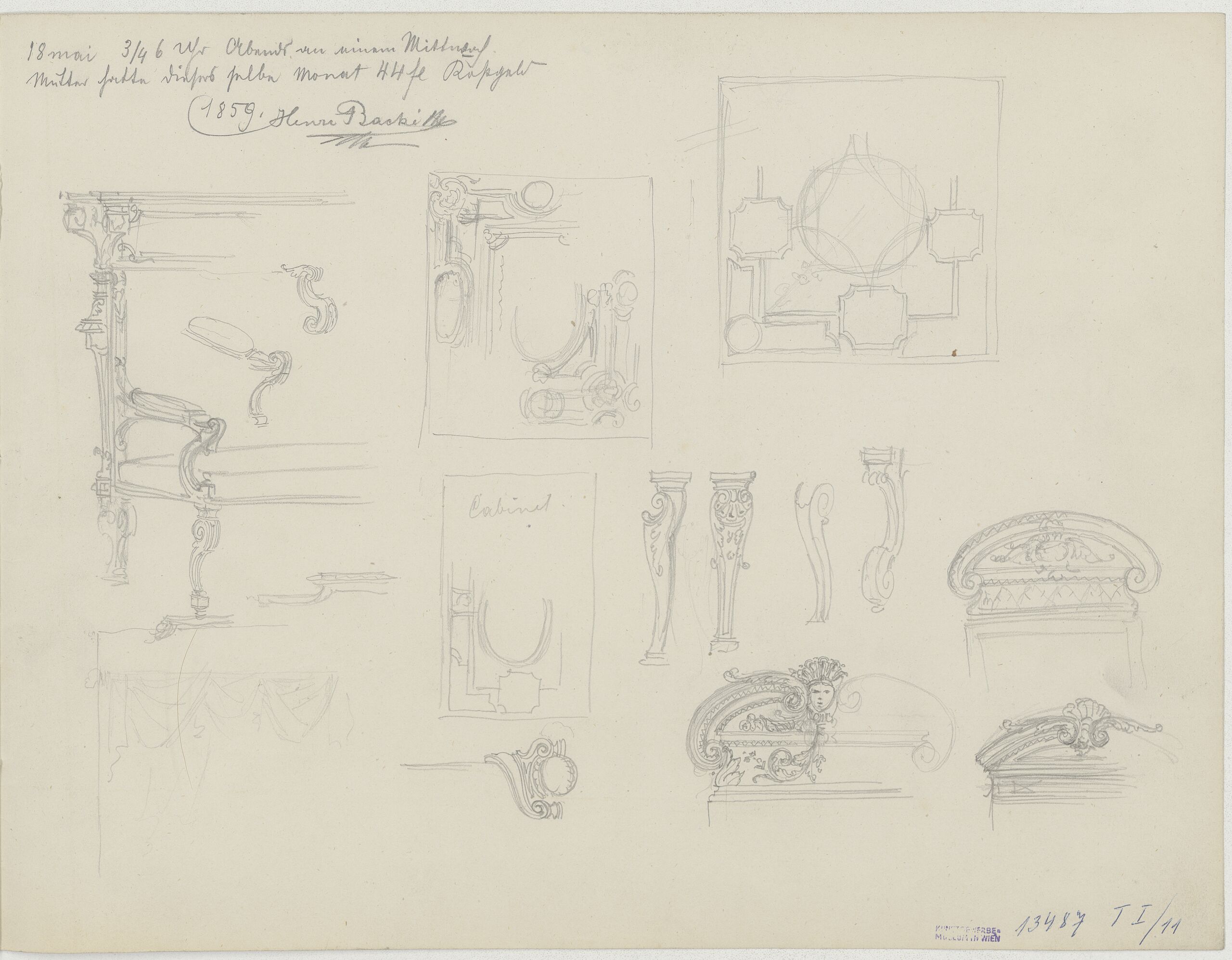sketch, Seite aus einem Skizzenbuch mit Skizzen zu einer Bank, verschiedenen Plafonds, Dekorationen für Supraporten und einzelnen Möbelelementen, Heinrich Hof-Tapezierer Backé, MAK Inv.nr. KI 13487-20-1-11-2