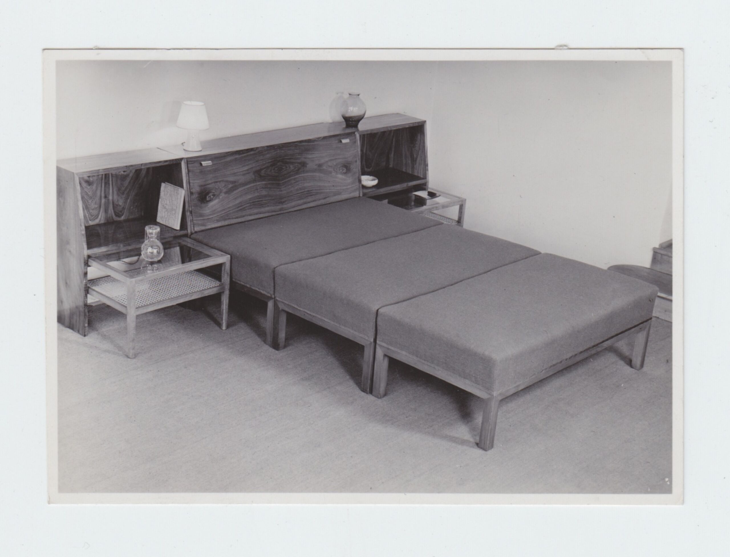 photograph, Sofa dreiteilig zu Doppelbett zusammengestellt, Ablage mit Fächern, Bettzeugraum und Nachttischchen, Werkstätte Hagenauer, MAK Inv.nr. HAF 1907