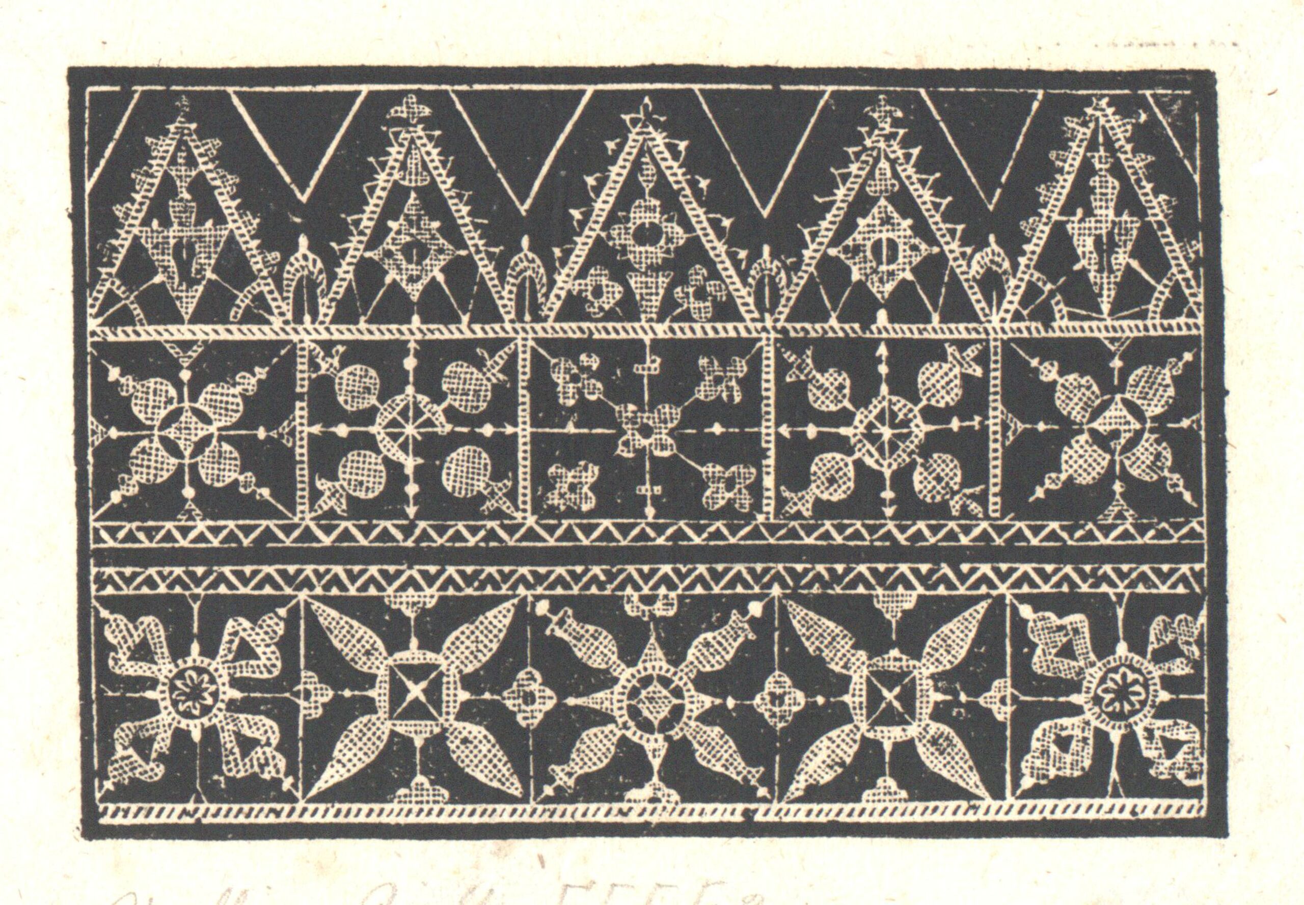 - Spitzenmuster, weiß auf schwarz aus der Folge „Corona delle Nobili et Virtuose Donne etc.“, herausgegeben von Cesare Vecellio, vgl. B. I. 2351 (K. I 16) (given title)