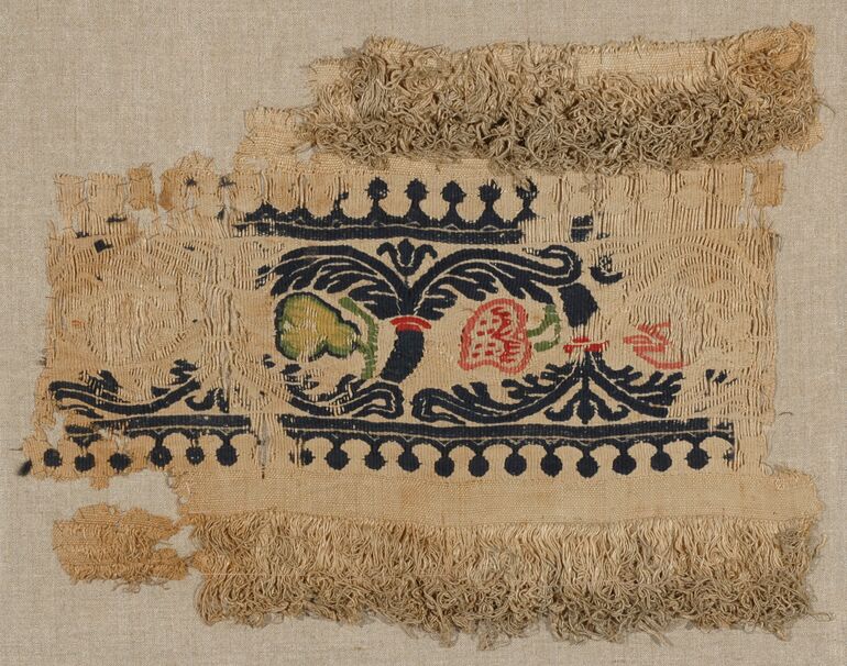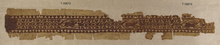 woven textile fragment, Square embellishment with bright rosettes surrounded by vine scrolls on purple ground, Anonym, MAK Inv.nr. T 670
