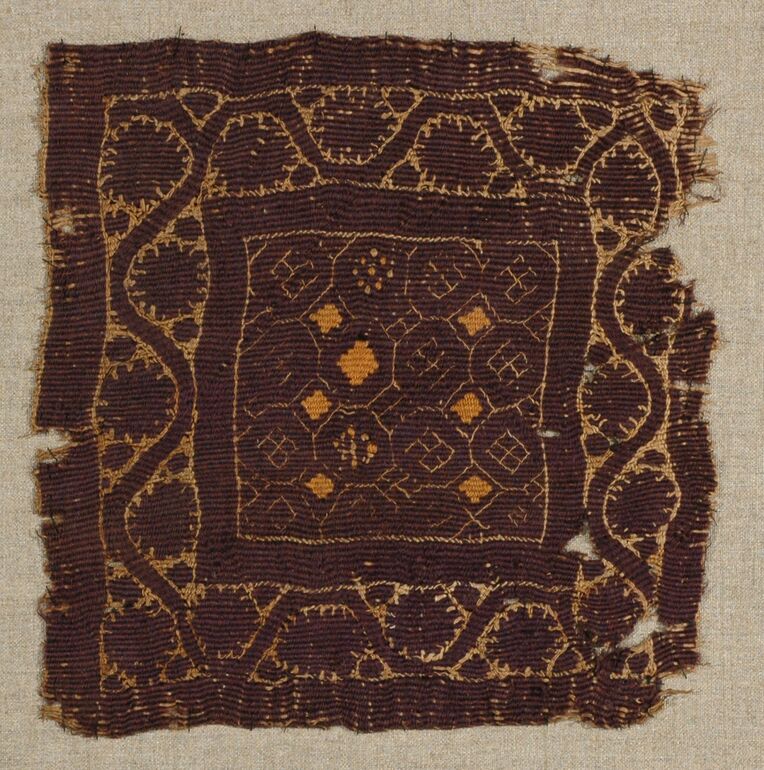 - Square embellishment with bright rosettes surrounded by vine scrolls on purple ground (descriptive title)