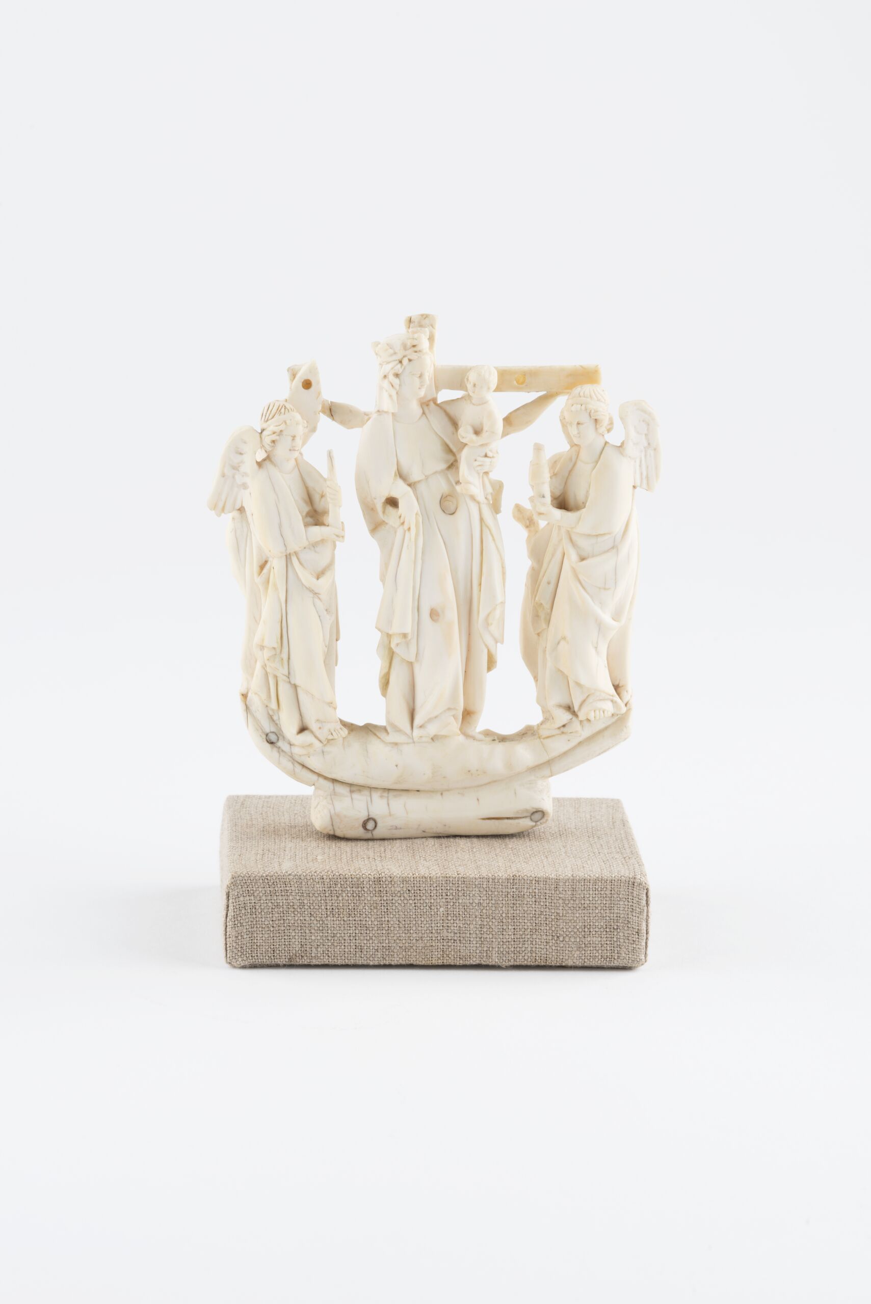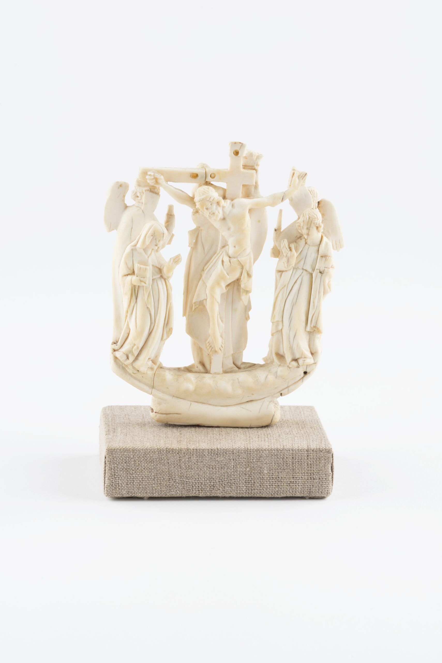 Gruppe aus der Krümme eines Pastorale, auf einer Seite Maria und Johannes unter dem Kreuz, auf der anderen Seite Maria mit dem Jesuskind von zwei Engeln flankiert.