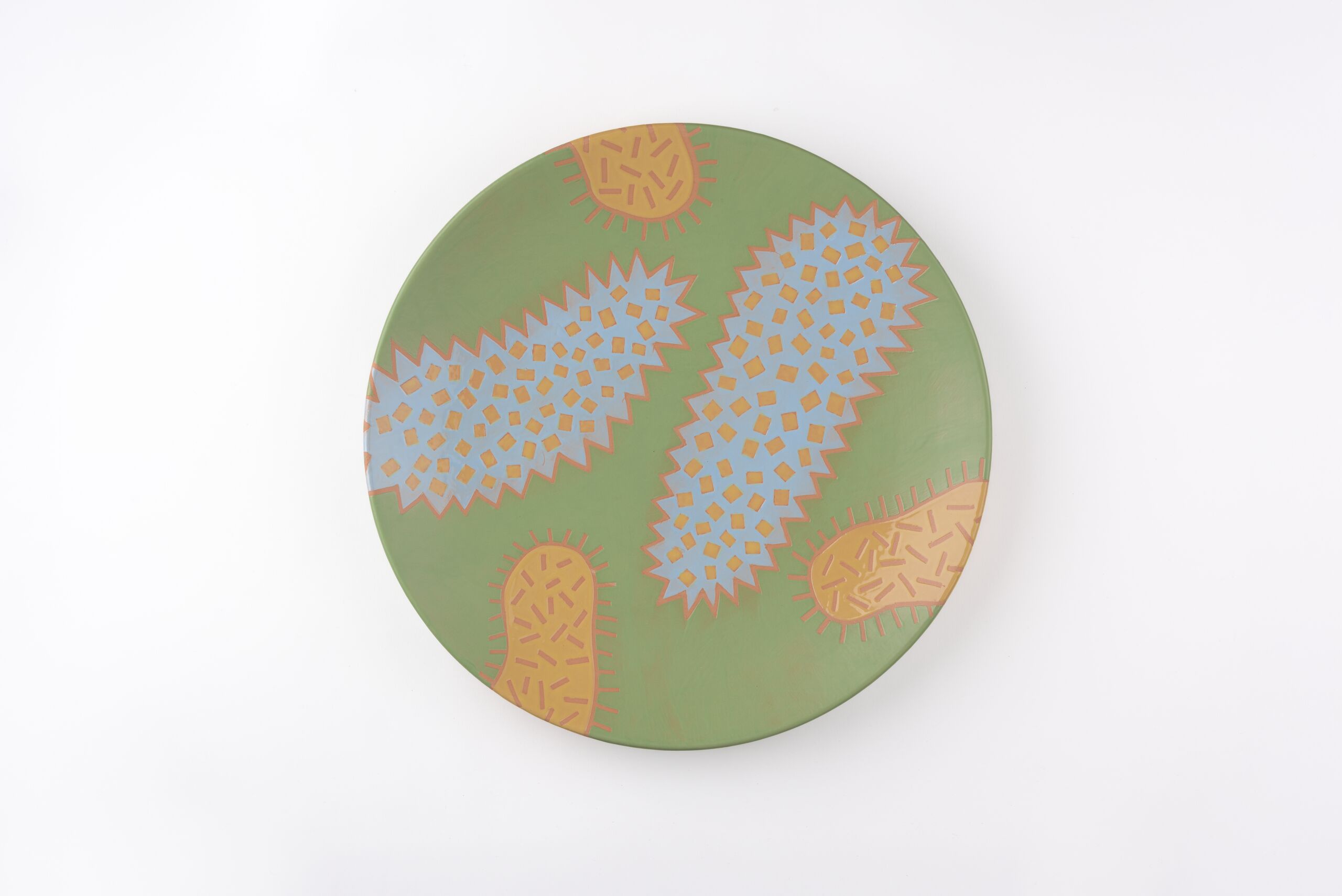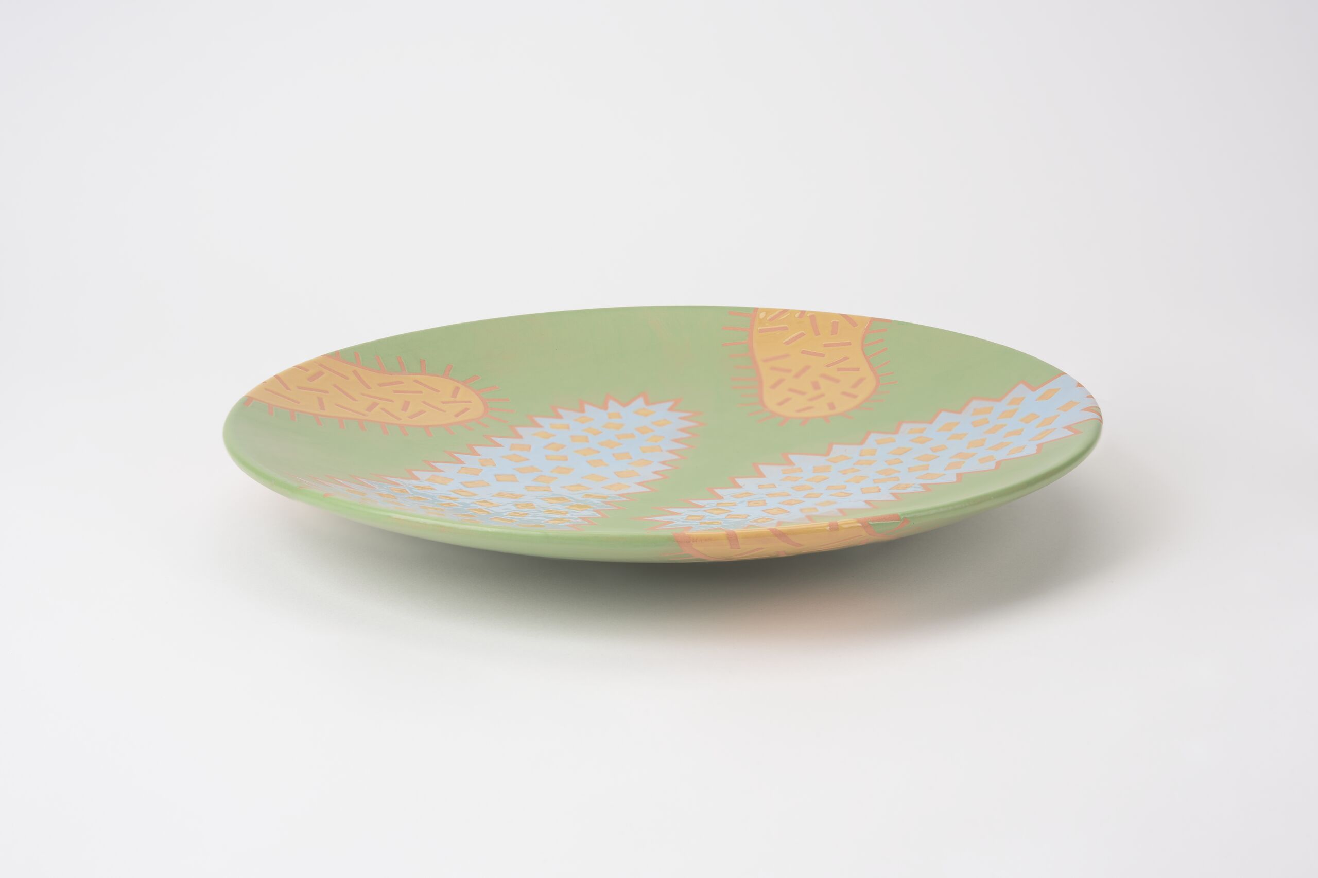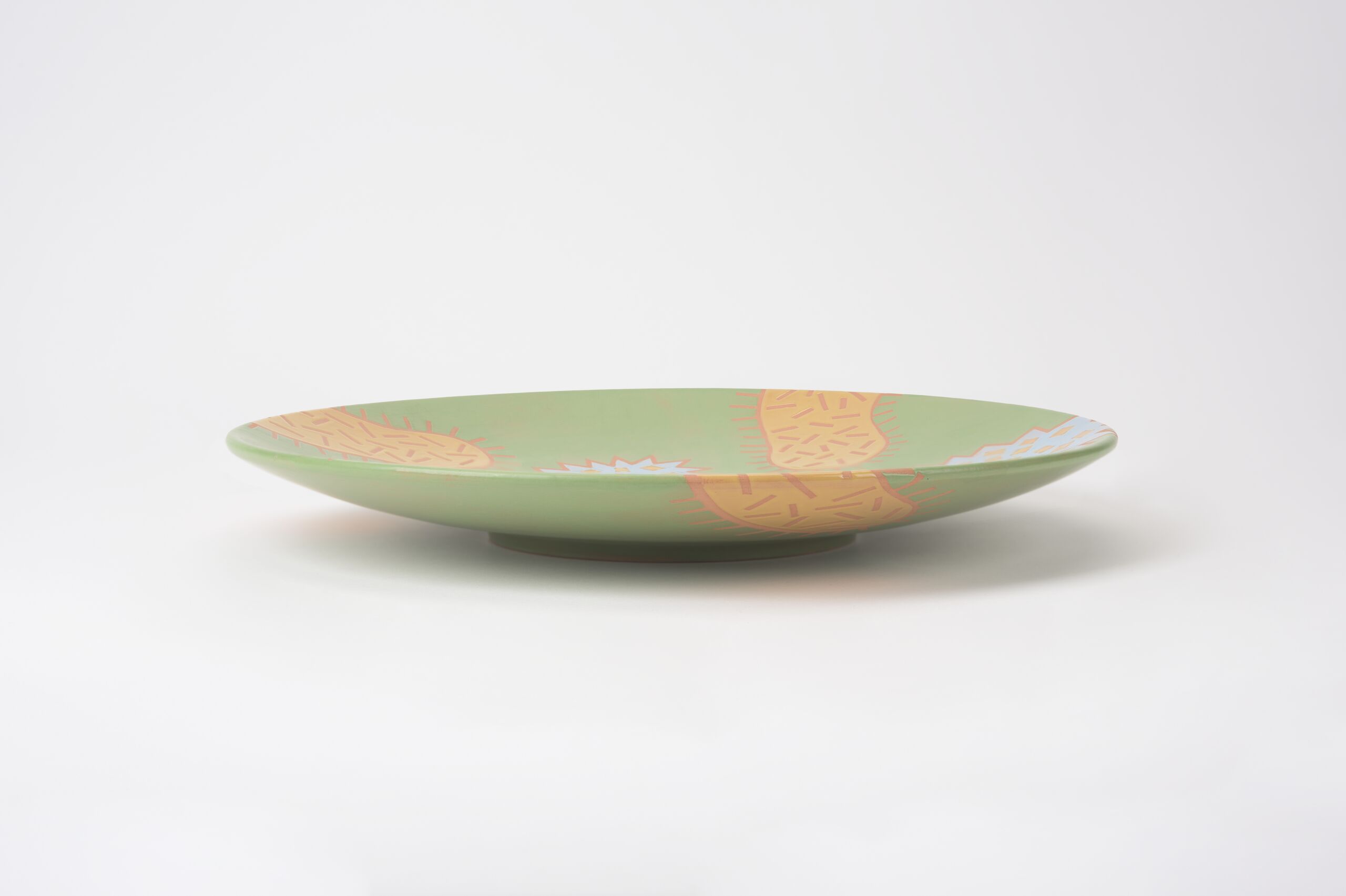 große Schale, grün matt glasiert mit kakteenförmigen blau gelb glasierten Aussparungen