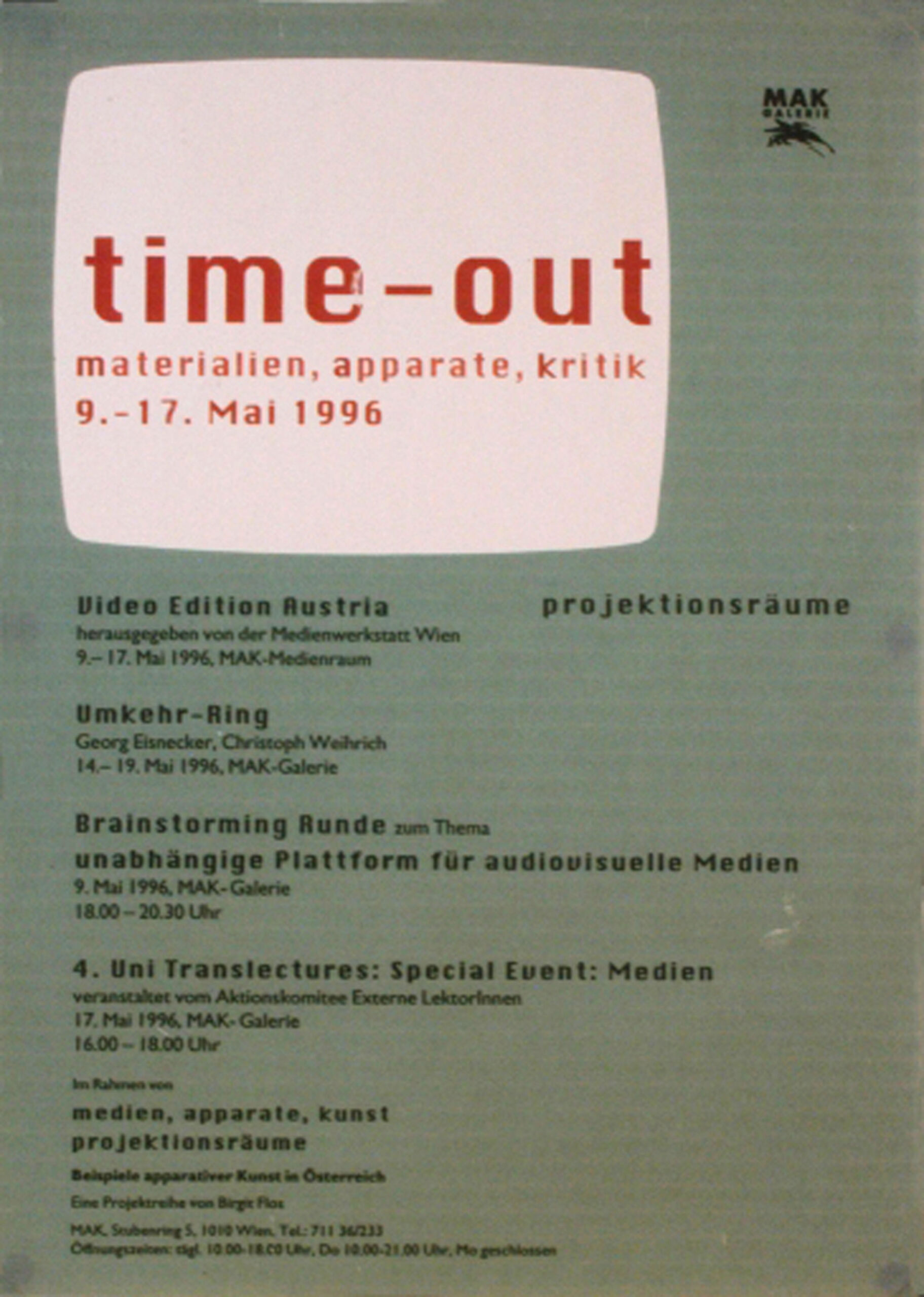 - 作品に記載されている文章: time-out. Materialien , Apparate, Kritik. Im Rahmen von Medien, Apparate, Kunst. Projektionsräume. Mak Galerie. 9.-17.Mai 1996
