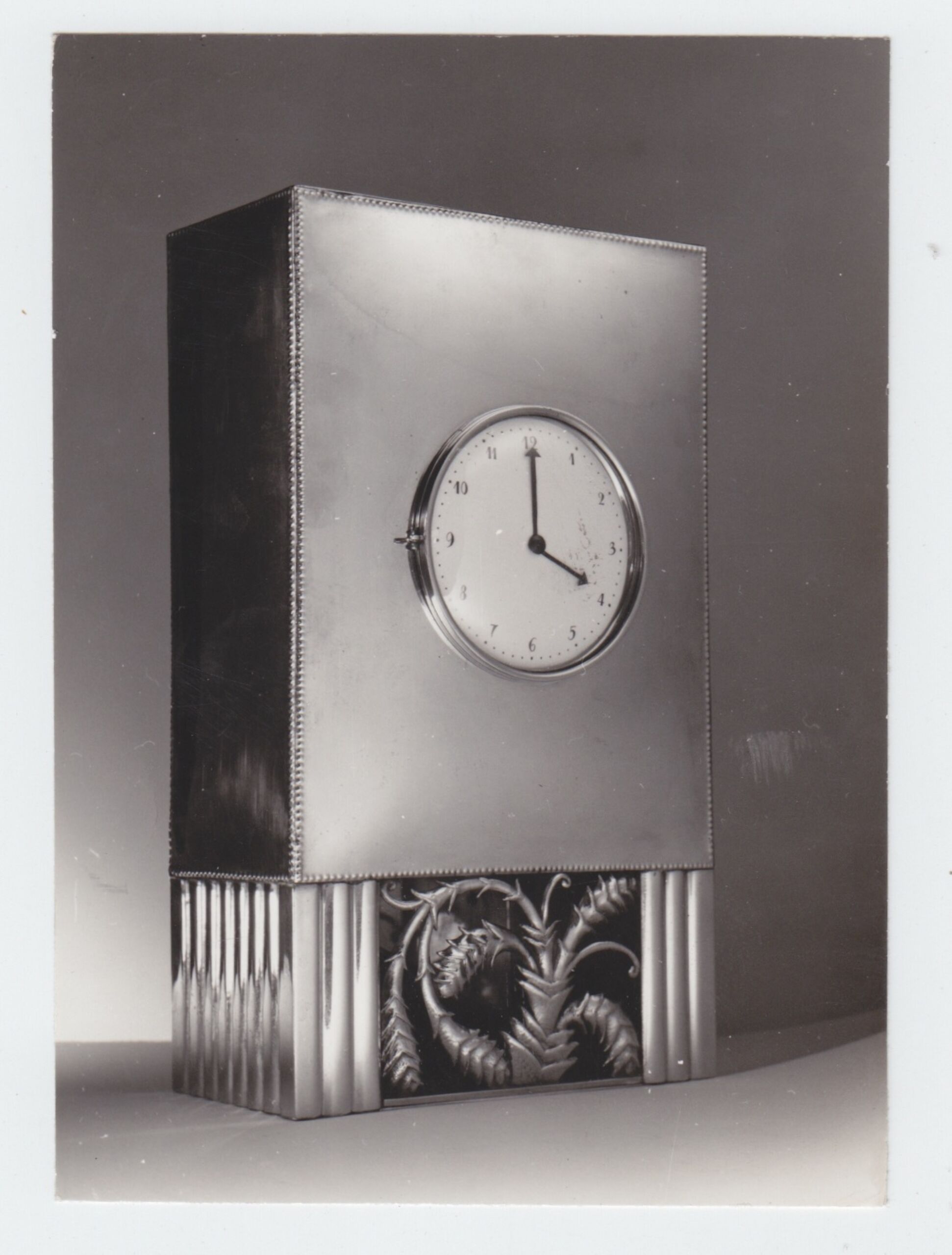 photograph, Tischuhr, glatter Uhrkasten mit Perlstab eingefasst, kannelierter Fuß mit Blattmotiv in der Mitte, Durchbruchsarbeit; Alpaka versilbert, Carl Hagenauer, MAK Inv.nr. HAF 2176