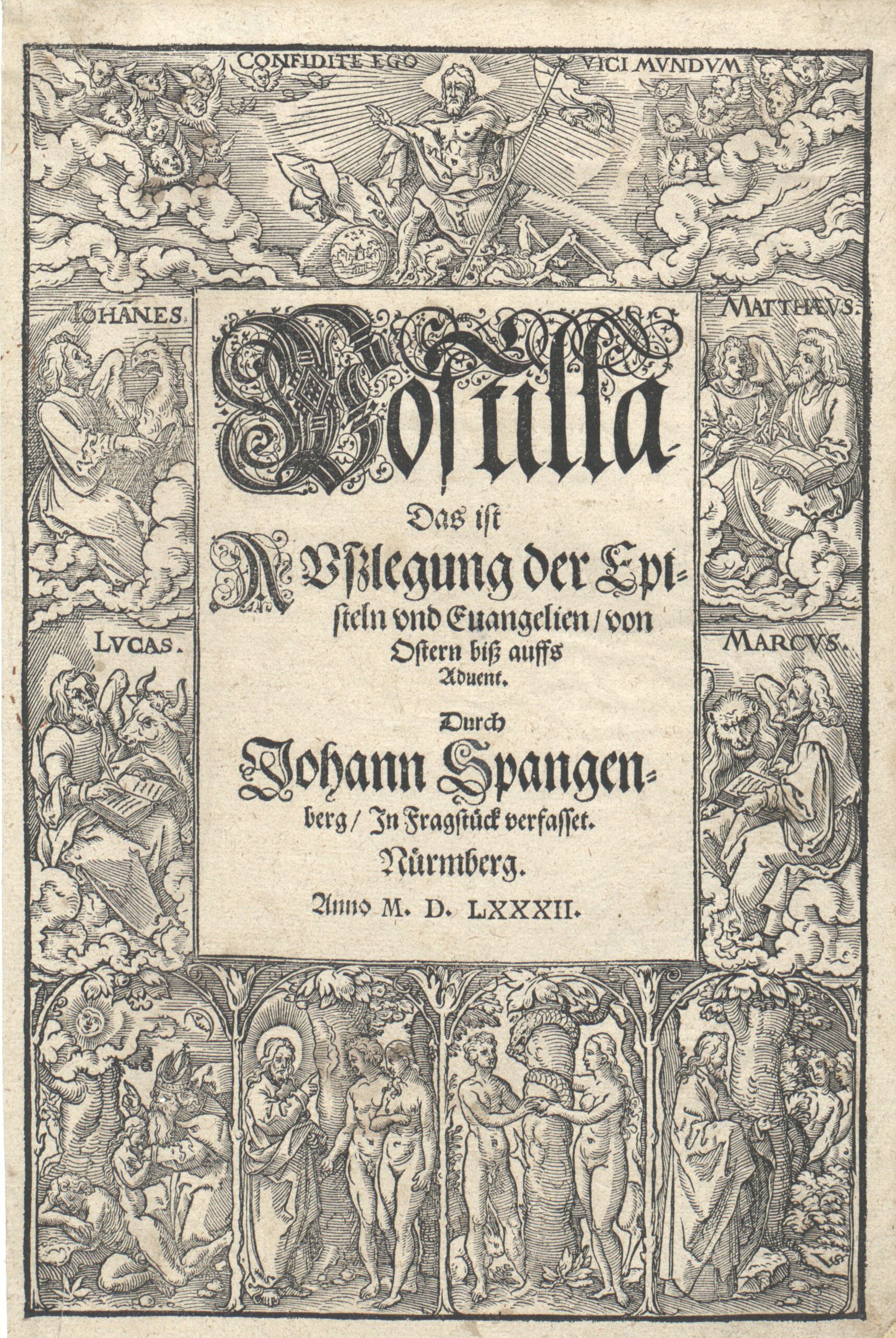 - Titel zu Spangenberg´s Postilla, Nürnberg 1582, oben der Erlöser, zu Seiten die vier Evangelisten, unten die Schaffung des Weibes, Adam und Eva, der Sündenfall, Illustrationen der Postilla siehe Fach 45/ 47- 57 (given title)