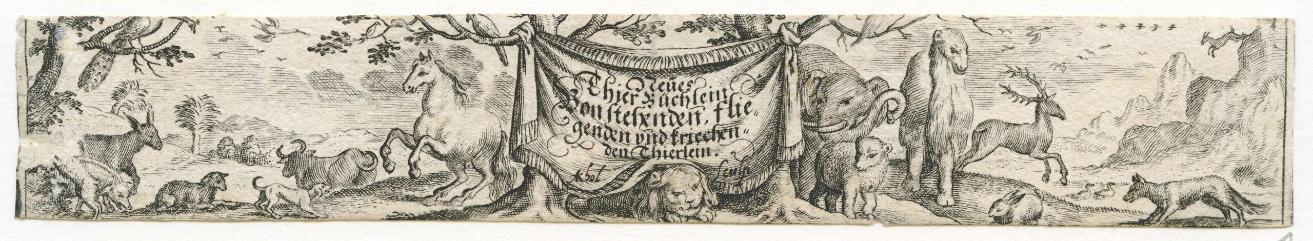 - 作品に記載されている文章: Neues/ Thier Büchlein/ Von stehenden, flie=/ genden und kriechen=/ den Thieren / Kohl sculp. / 1