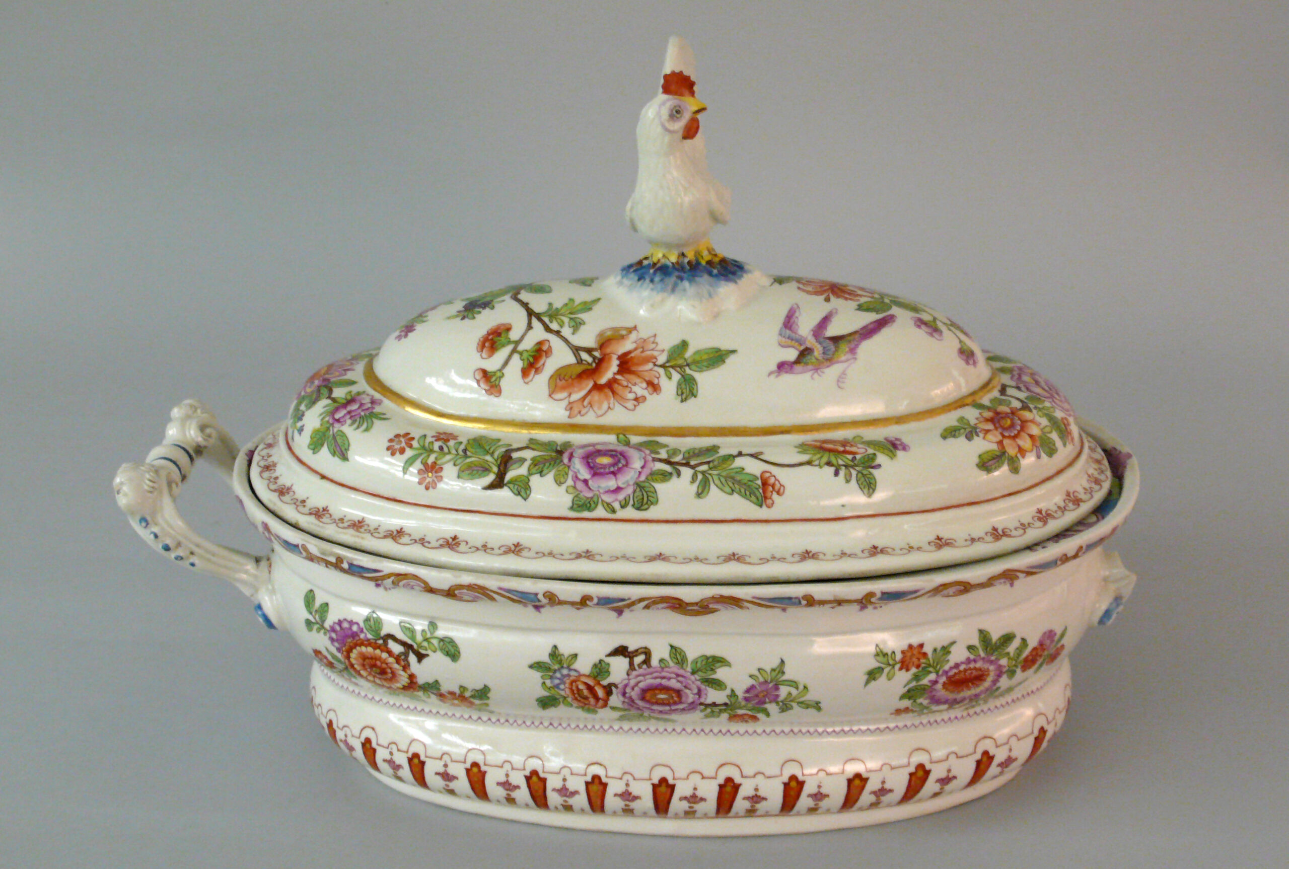 Deckelterrine mit Henkeln, auf ovalem, niedrigem Standring zweifach gedrückter Unterteil mit plastischem Doppelhenkel. Terrine und Deckel mit bunten indianischen Blumen und Gold bemalt