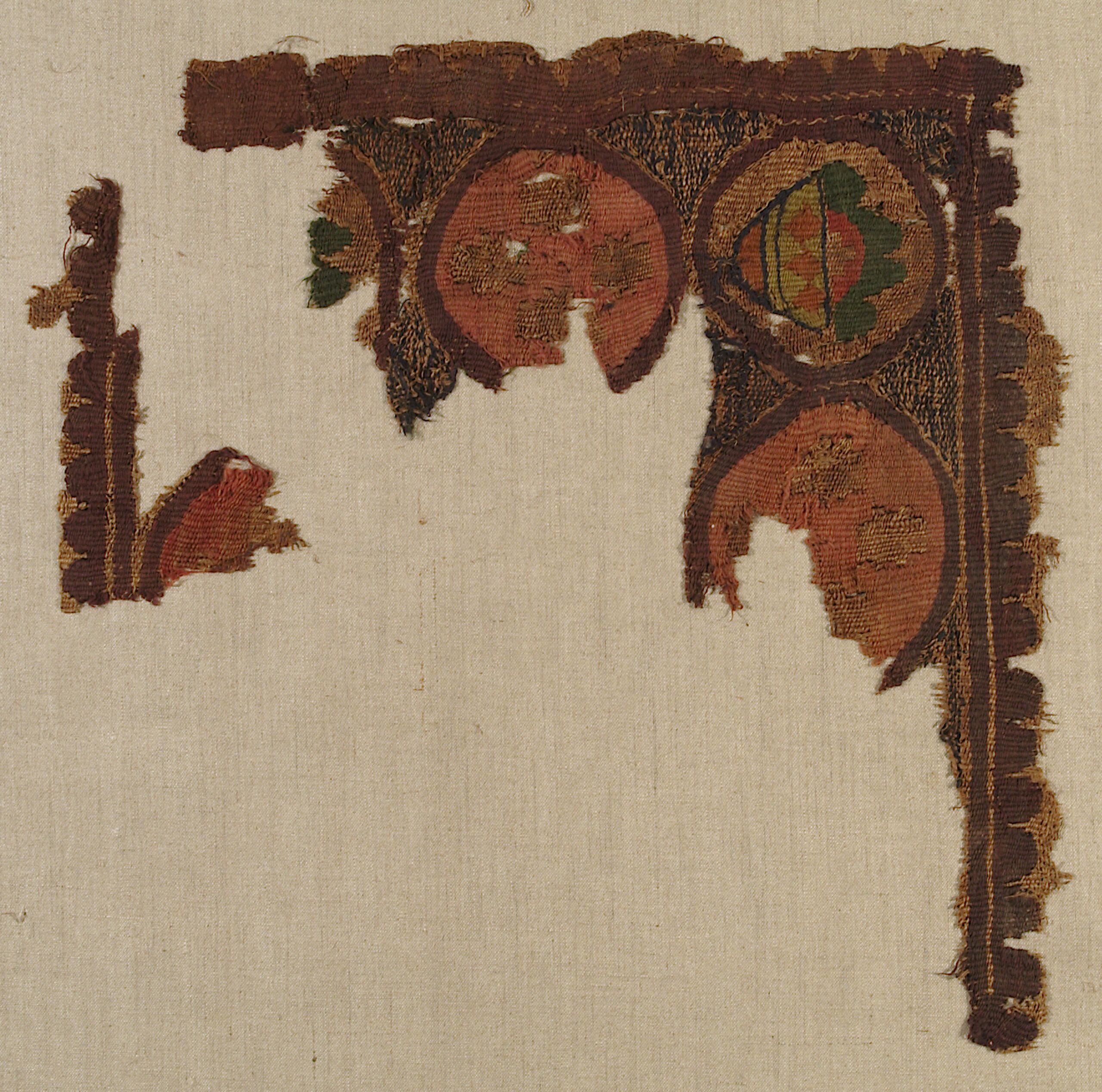 woven textile fragment, Two fragments of a square embellishment (tabula); medallions in a row with fruit basket and rosettes (?), Anonym, MAK Inv.nr. T 10562