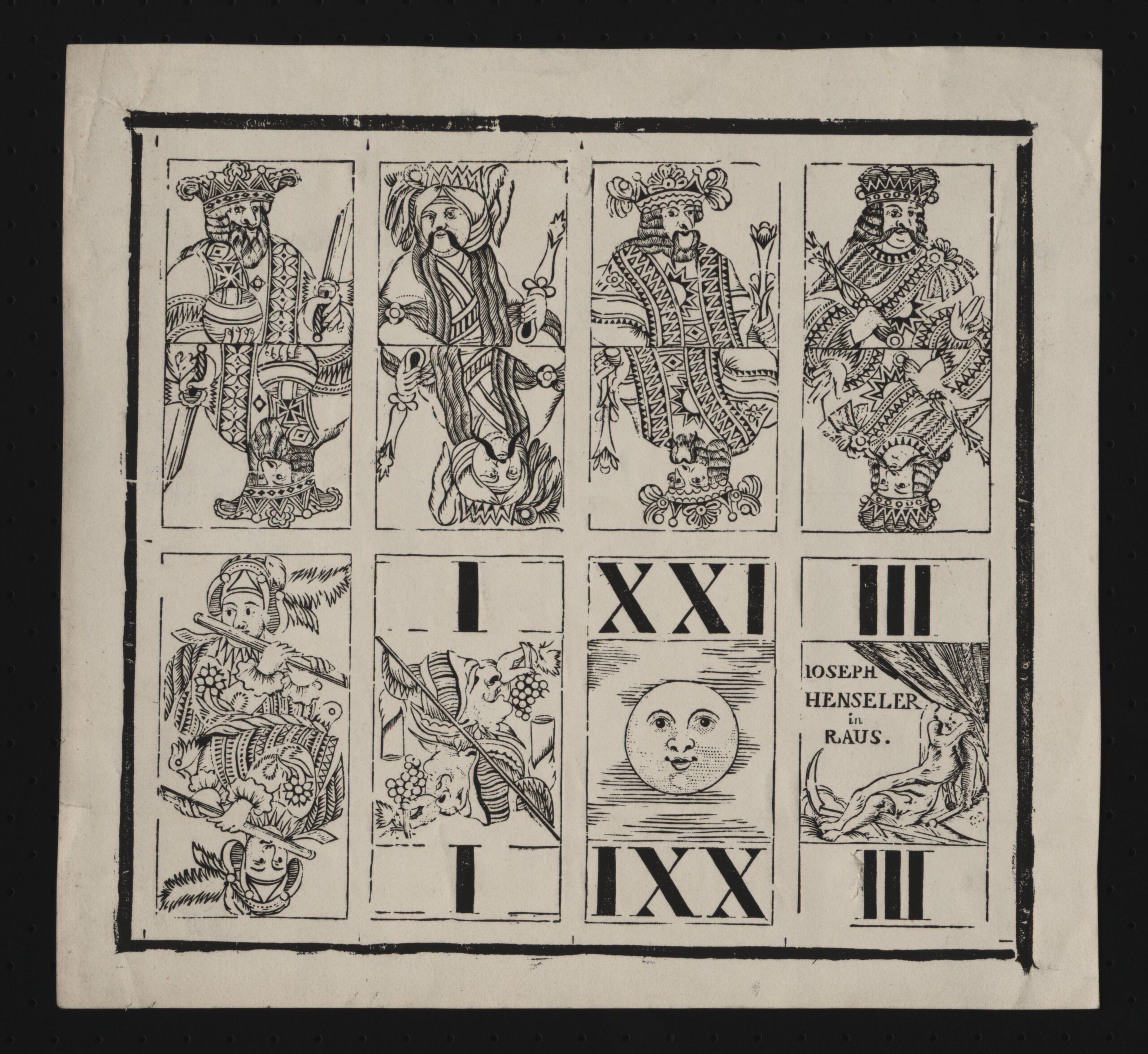 playing card, Unbeschnittener Druckbogen mit dem Neudruck eines Tarock-Kartenspiels im Stil des 18. Jahrhunderts von Joseph Henseler, Joseph Henseler, MAK Inv.nr. KI 13399