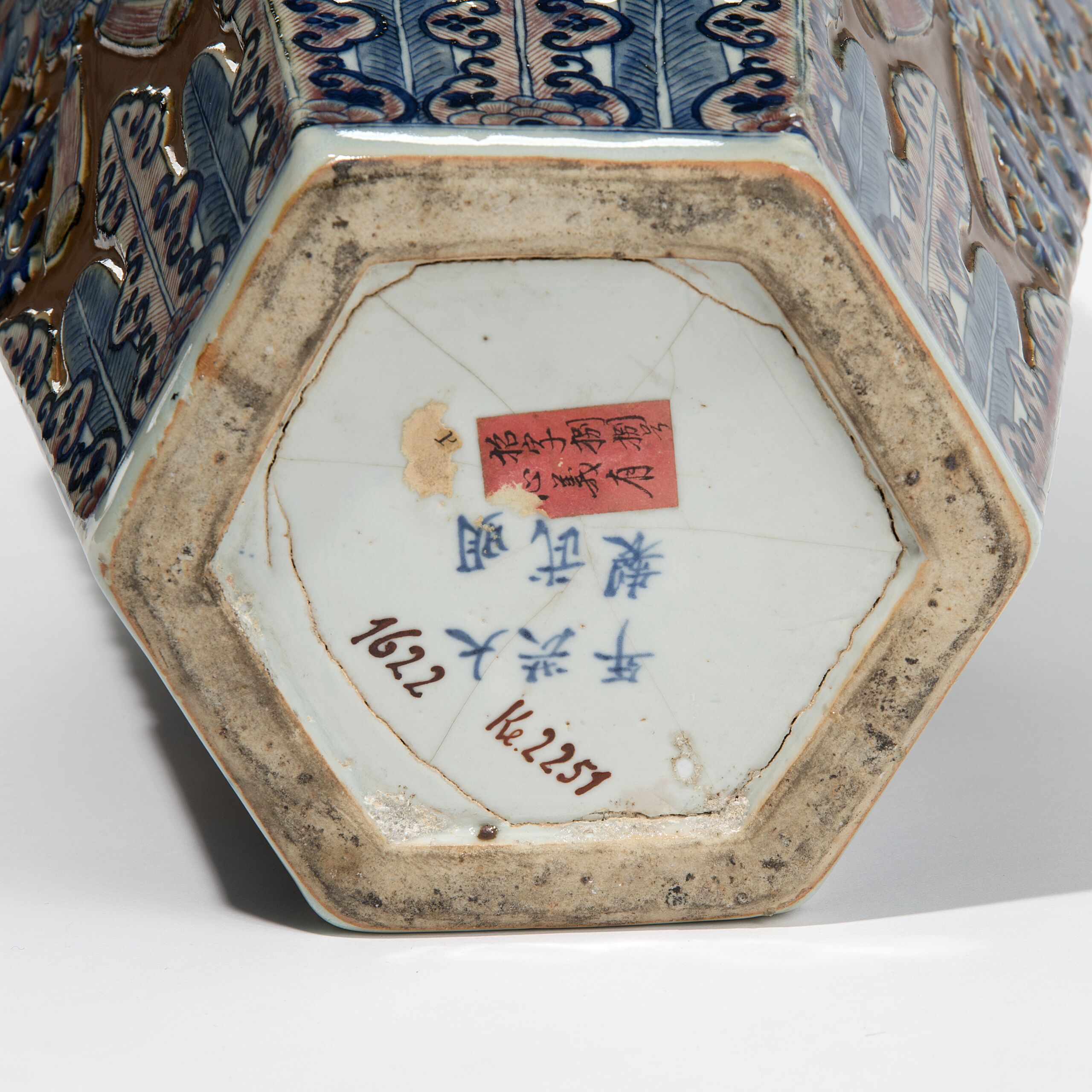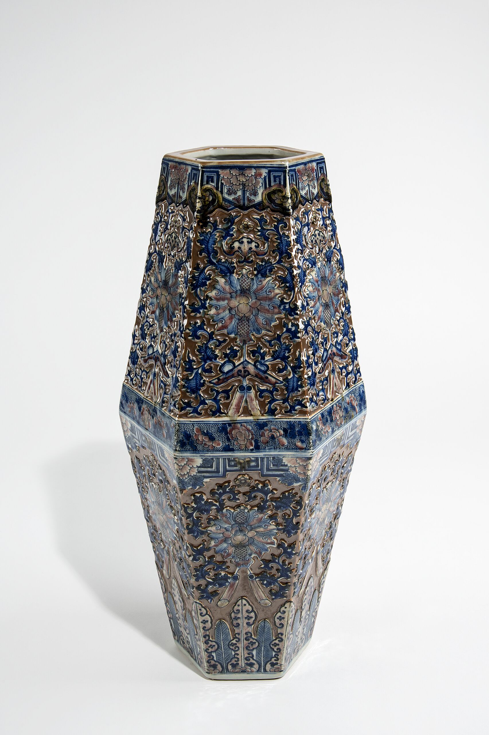 sechseckige Vase mit Reliefdekor und Bemalung unter der Glasur in Kobaltblau und Rot