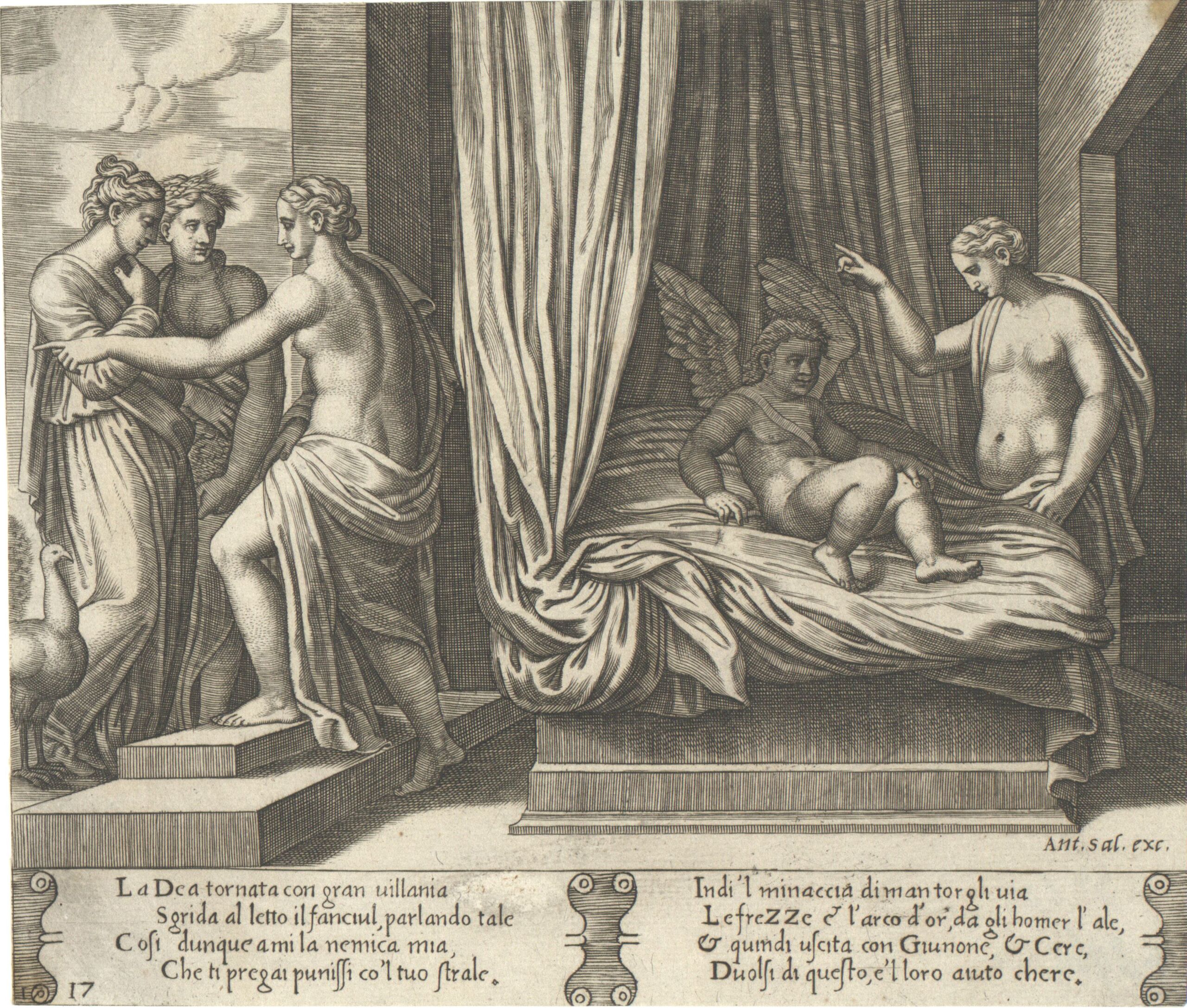 - Venus ermahnt Amor, Blatt 17 aus der Folge der Fabel der Psyche, Abdruck der von Franc. Villamena überarbeiteten Platten, herausgegeben von A. Salamanca; nach Vasari soll Michiel Coxcie die Vorlagen für die Stiche angefertigt haben (given title)