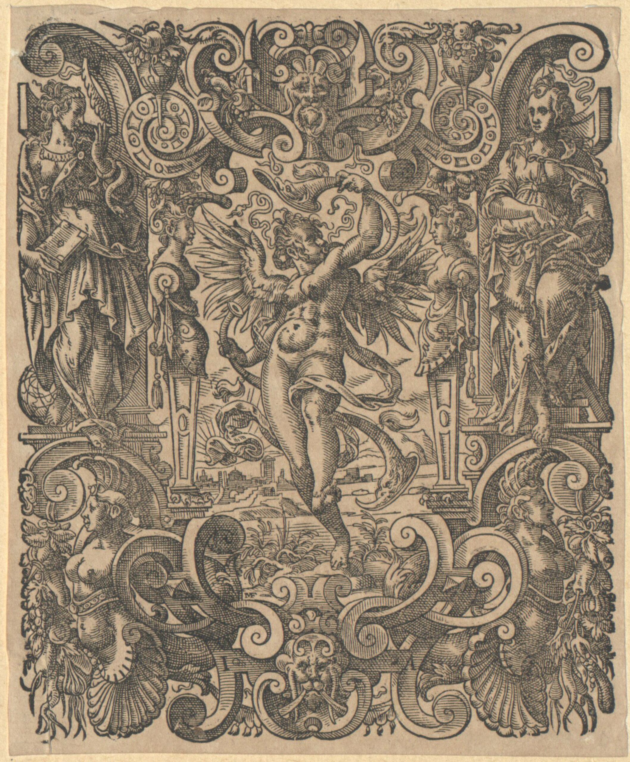 printer's mark, Verhandlung zwischen Papst und Kaiser, darunter Signet des Sigmund Feierabend, Jost Amman, MAK Inv.nr. KI 3226