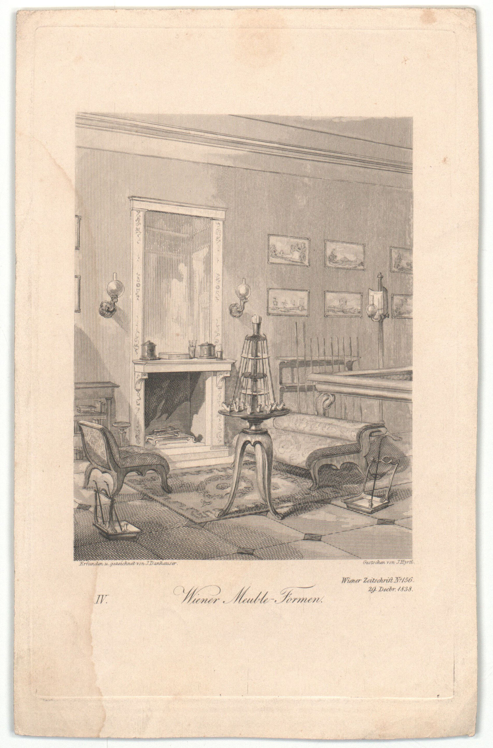 - 作品に記載されている文章: "Erfunden u. gezeichnet von J. Danhauser"; "Gestochen von J. Hyrtl"; "IV. Wiener Meuble-Formen" sowie "Wiener Zeitschrift N° 156 / 29. Decbr. 1838."