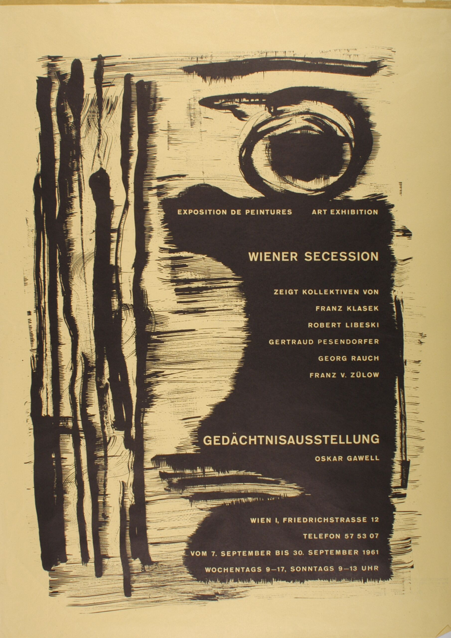- 作品に記載されている文章: Wiener Secession zeigt Kollektiven von Franz Klasek, Robert Libeski, Gertraud Pesendorfer, Georg Rauch, Franz v. Zülow. Gedächtnisausstellung Oskar Gawell. 7. September - 30. September 1961